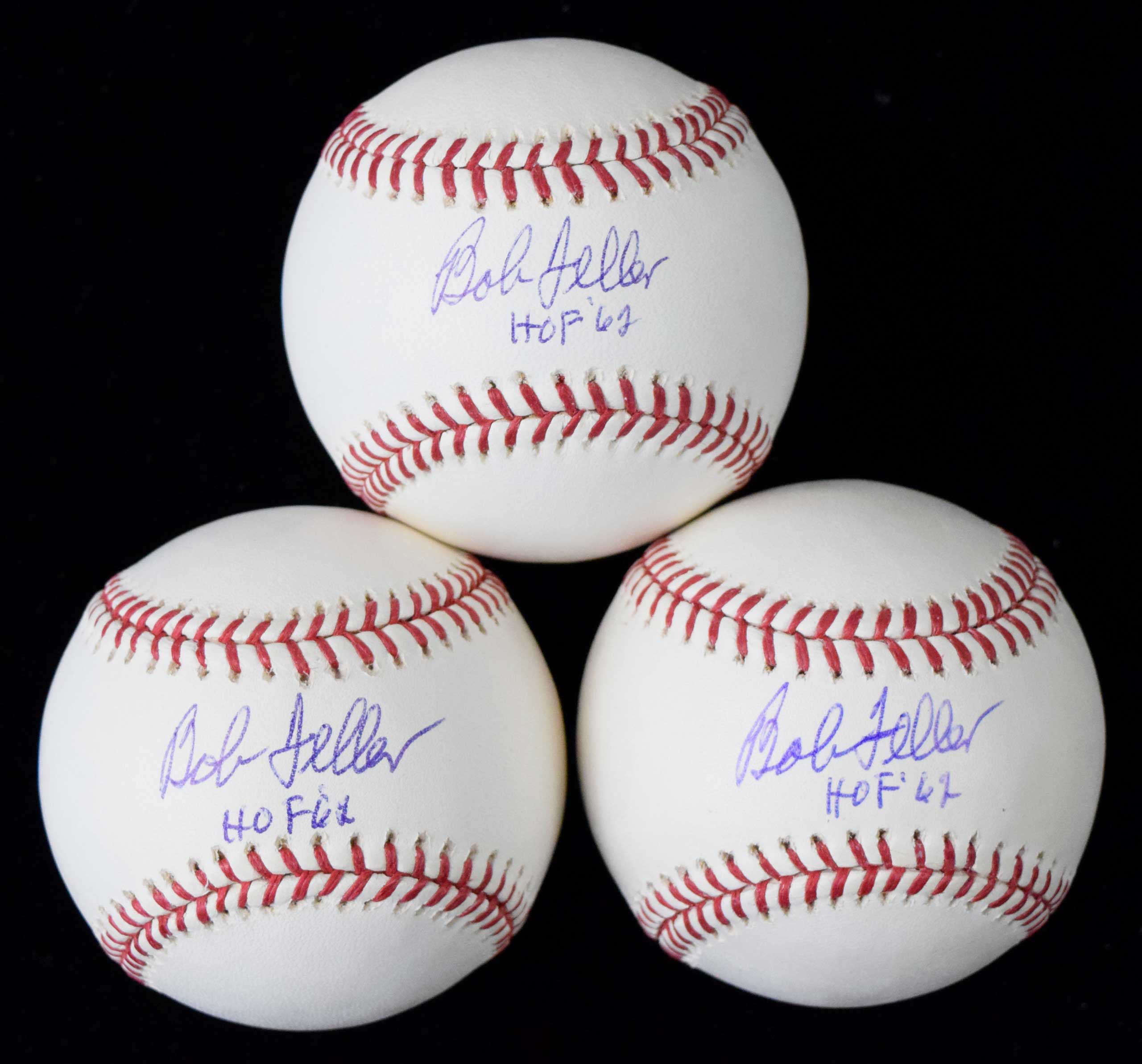Lot of (3) Bob Feller single signed baseballs (NM) Rawlings B.Selig OML balls, each signed in ink rating 7/8 out of 10: NM