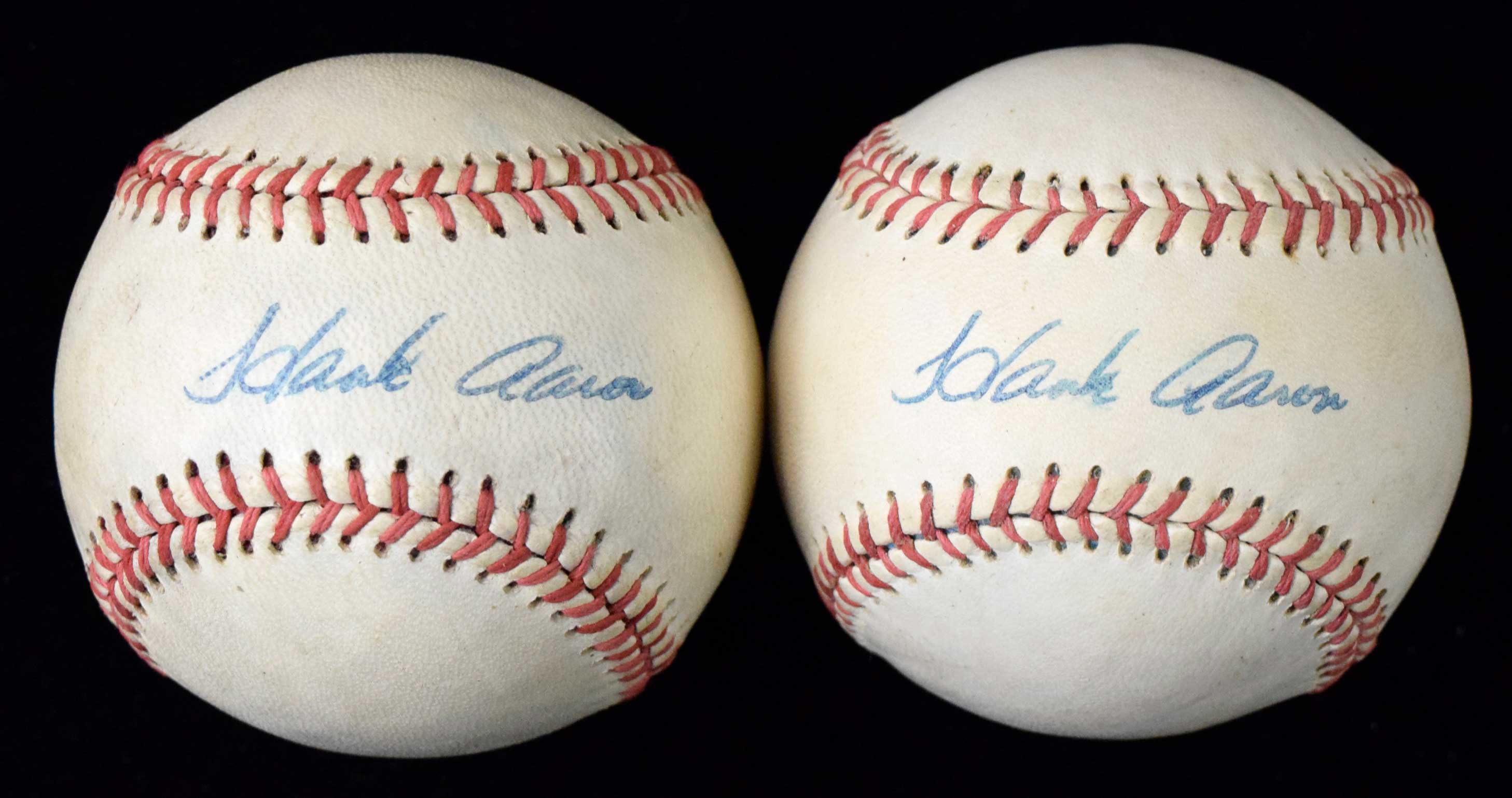 Description:Lot of (2) Hank Aaron vintage single signed baseballs (Sigs. EX/MT-NM, Balls EX) Pair of Wilson Prep League balls are each signed in ink rating 7/8-8 out of 10. Soiling and some other light to mild wear throughout: Sigs. EX/MT-NM, Balls EX