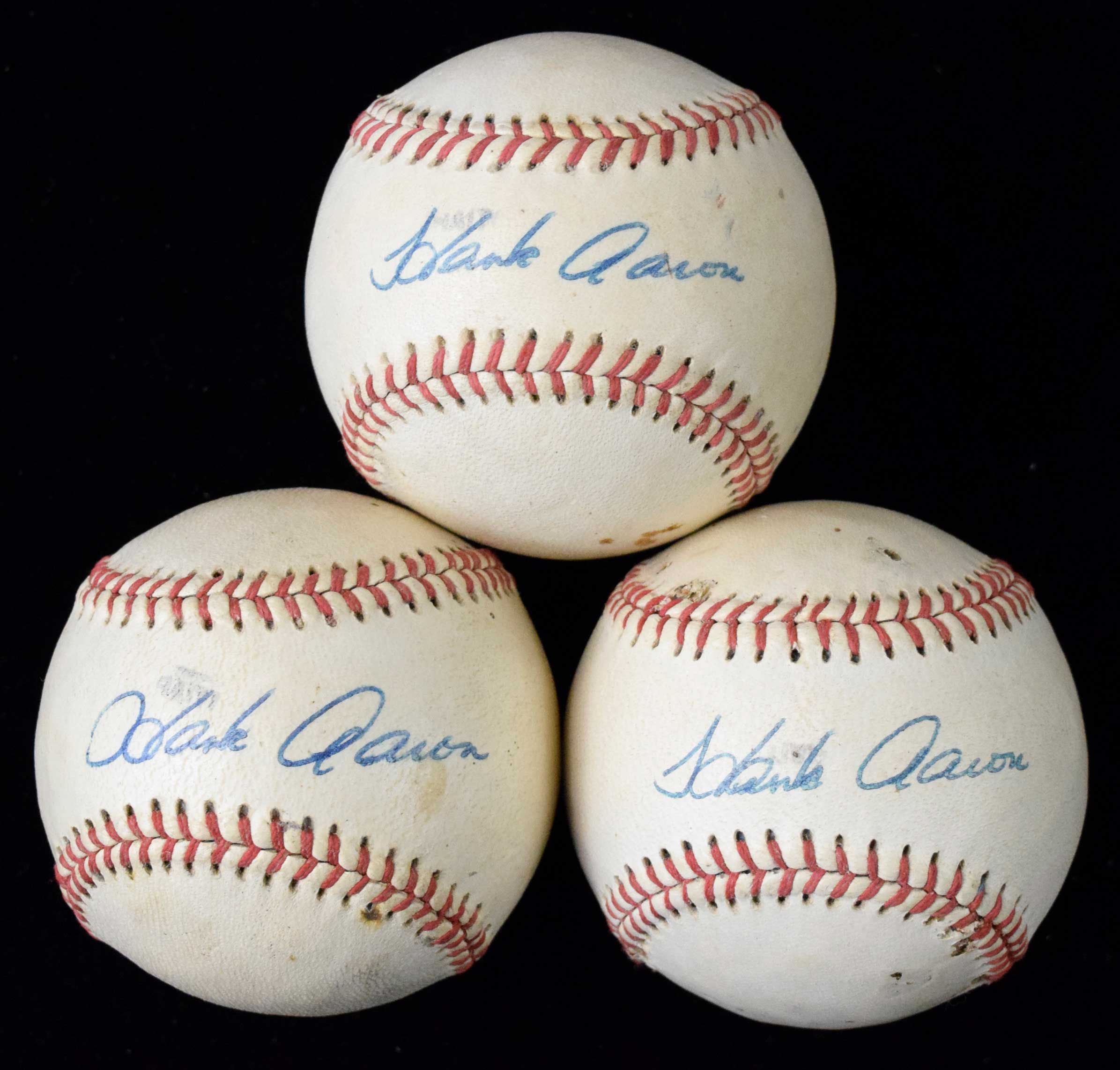 Description:Lot of (3) Hank Aaron vintage single signed baseballs (Sigs. EX/MT-NM, Balls GD-EX) Trio of Wilson Prep League balls are each signed in ink rating 8 out of 10. All have soiling and some other mild scattered wear and one is severly effected with portions of the leather surface missing: Sigs. EX/MT-NM, Balls GD-EX