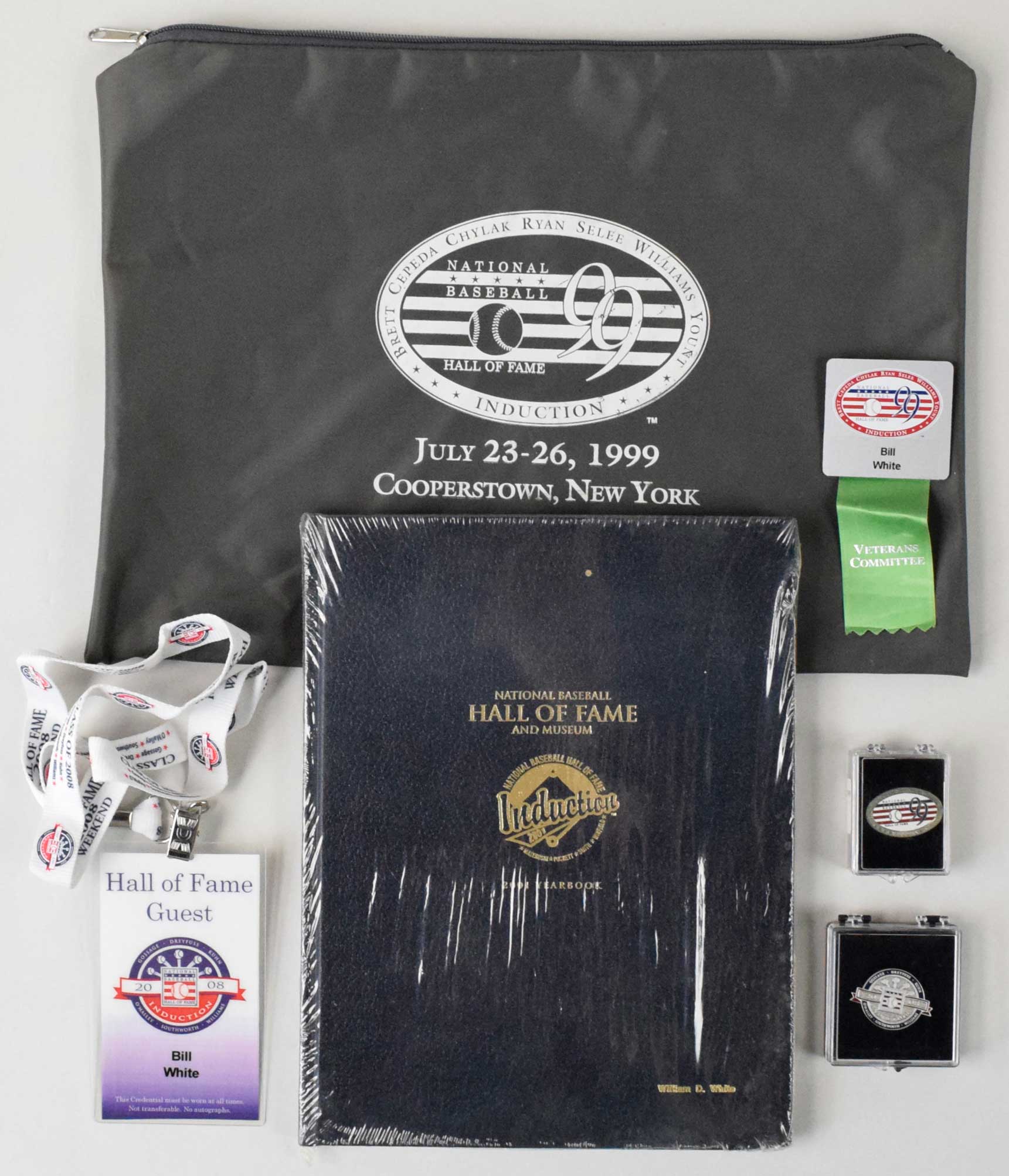 Description:Hall of Fame Induction related material from the White Collection incl. badges and press pins/charms (EX-NM) Includes 2001 hardcover yearbook with White's name impressed on the front; 2001 dated Hall logo ornament; invitations/tickets/similar to numerous Hall of Fame Inductions and some other Hall related events in Cooperstown; cloth pouches as issued for 1999, 2000, and 2008 Inductions. The 2008 is filled with Induction weekend related material; (2) 1990 Hall of Fame paperstock passes (no names filled in); "Guest" badges issued to White for the 1993, 99, 2000, 2001, and 2008 Inductions; Press pins from 1999 and 2008; Press charms from 1991, 93, 94, and 2000. Varying degrees/types of wear throughout: EX-NM