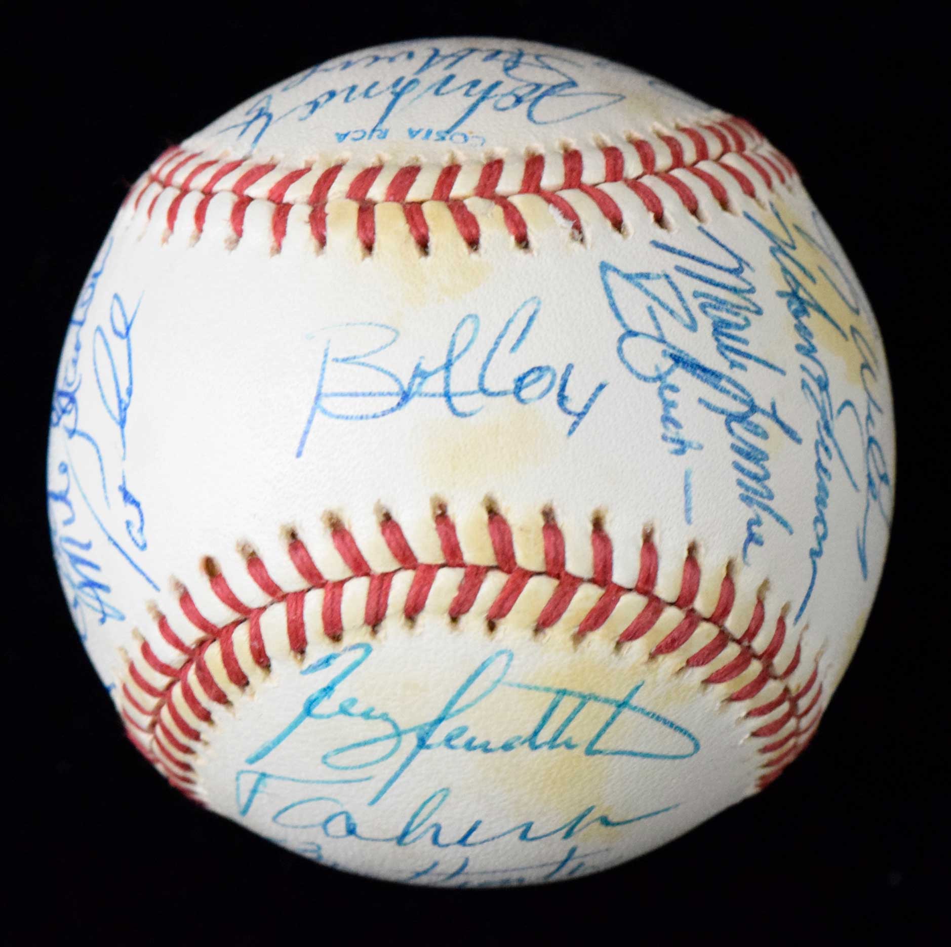Description:1991 Atlanta Braves team signed World Series logo baseball (EX/MT-NM) Rawlings Official game logo ball has been signed by (28) incl. Cox, Pendleton, Glavine, Justice, Smoltz, and others. Ink signatures rate 8 to 8/9 out of 10. Light/mild scattered toning: EX/MT-NM