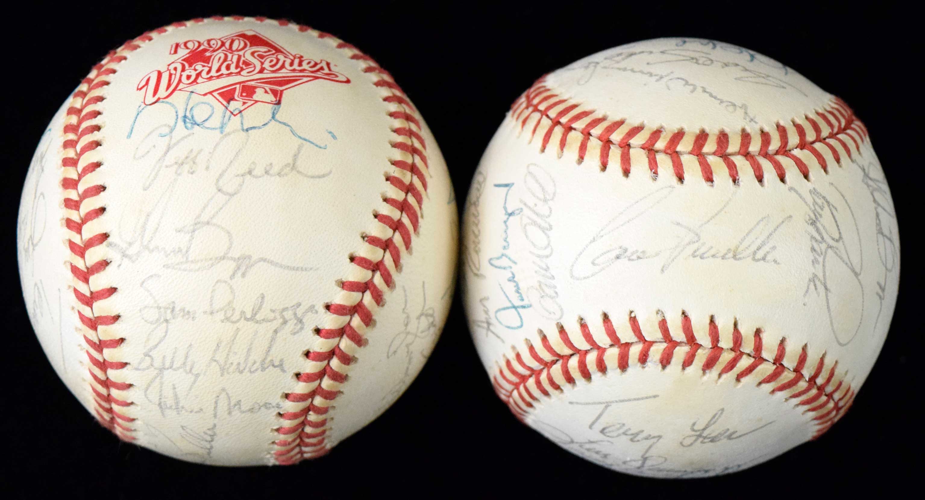 Description:Lot of (2) 1990 Cincinnati Reds team signed World Series logo baseballs (EX-EX/MT) Pair of Rawlings Official game logo balls, each signed by approx. (27) incl. Larkin, Davis, Sabo, Perez, O'Neill, and Duncan. Pinella is clubhouse . Signatures rate 6/7 to 7/8 out of 10 and the balls display light/mild toning: EX-EX/MT