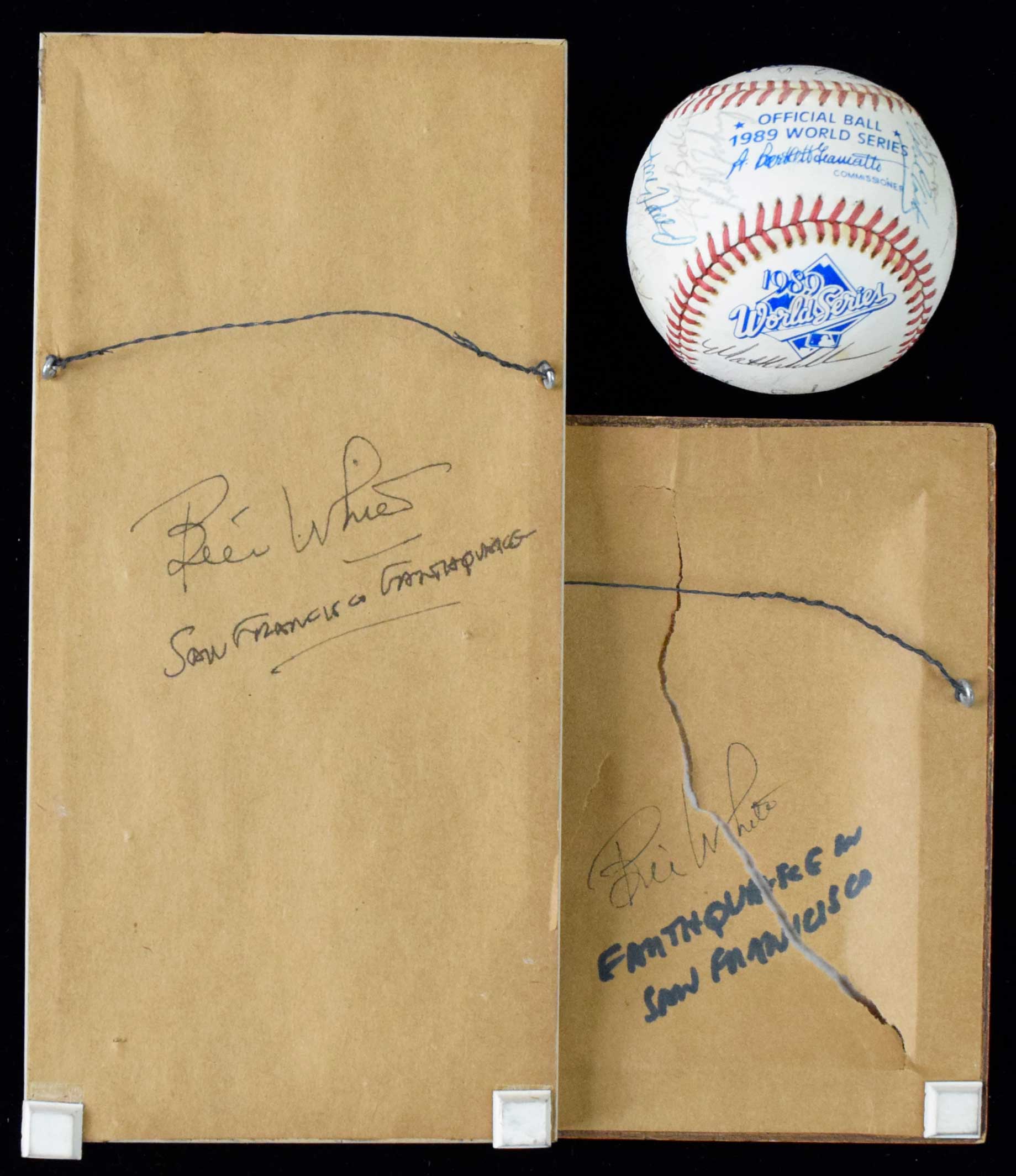 Description:1989 San Francisco Giants team signed ball with Earthquake game ticket and photo (VG-EX/MT) Includes Rawlings Official game logo ball which has been signed by (32) incl. Will Clark, Dusty Baker, Roger Craig, Matt Williams, and others. Signatures rate 6 to 7/8 out of 10 and there is some minor discoloration/toning to ball; small framed photo of Officials during the earthquake game in 6.56"x8.5" frame. The frame is signed on the back by Bill White however the paper (and signature) have a tear; full ticket to the earthquake game which is also framed and signed by White on the back: VG-EX/MT