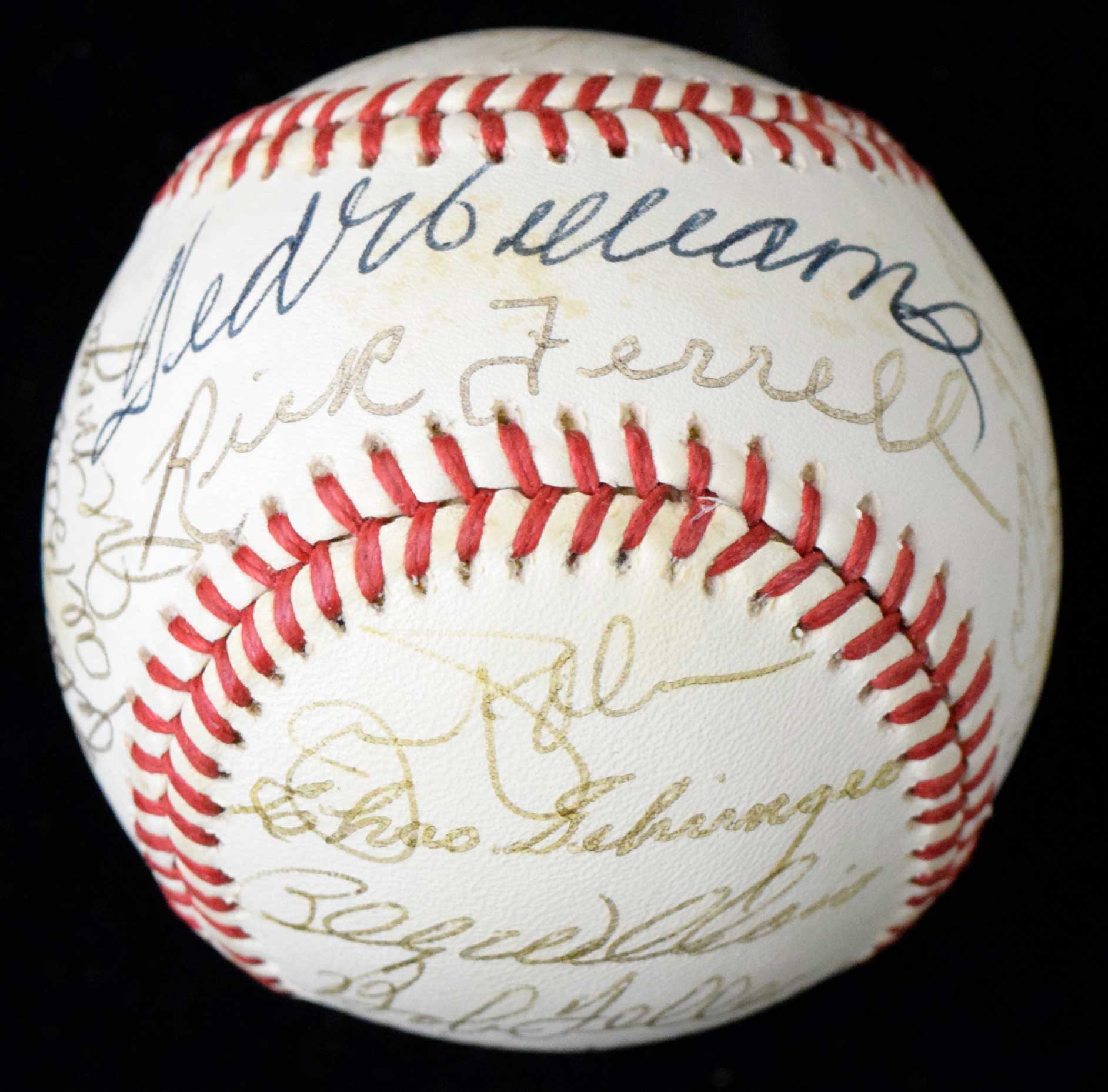 Description:Hall of Fame autographed baseball with (26) signatures incl. Ted Williams (GD-EX) Rawlings B.Brown OAL ball has been signed by Hall of Famers however approx. half of the autographs have faded. The stronger (6/7 to 7/8 out of 10) incl. Ted Williams, Yogi Berra, Eddie Mathews, Charles Gehringer, and Bob Feller: GD-EX
