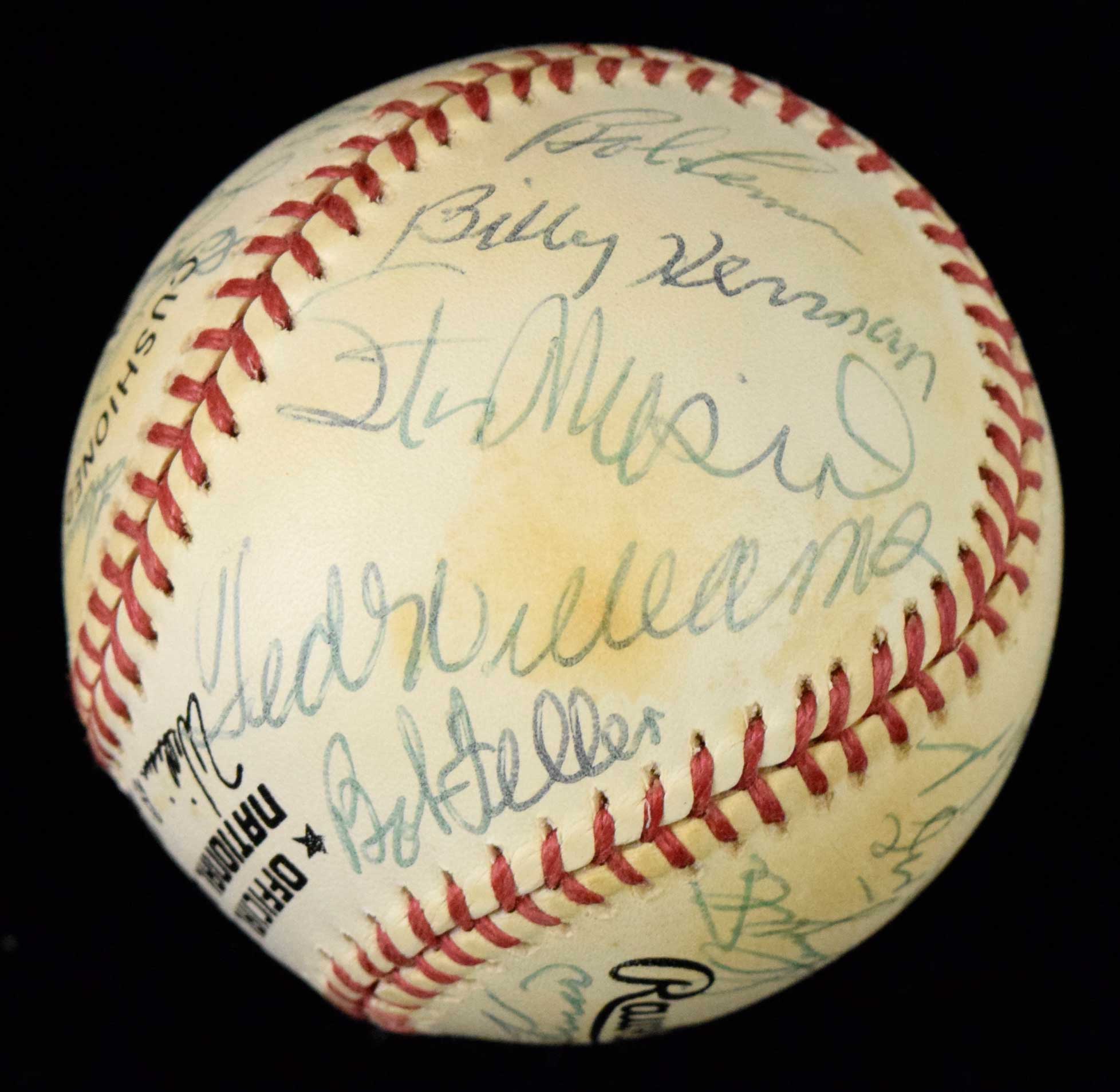 Description:Hall of Fame autographed baseball with (22) signatures incl. Ted Williams (EX/MT) Rawlings W.White ONL ball has been signed by (22) incl. Ted Williams, Pee Wee Reese, Stan Musial, Charles Gehringer, Carl Yastrzemski, Bob Feller, and others. Signatures rate 7-7/8 out of 10. Mild toning: EX/MT
