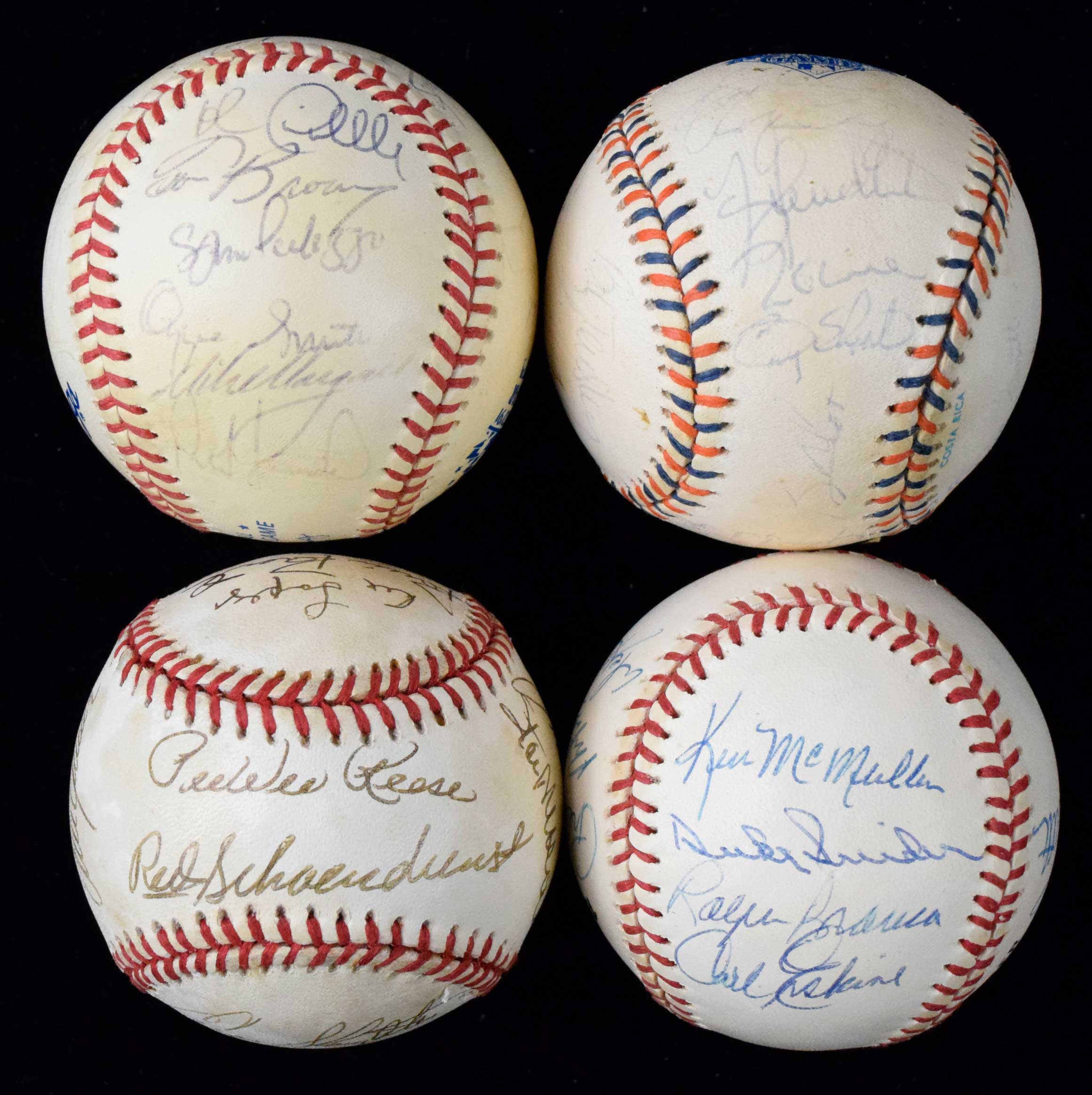 Description:Lot of (6) autographed baseballs from the White Collection (GD-EX) Includes Rawlings W.White ONL ball signed by (14) Hall of Famers incl. Pee Wee Reese, Stan Musial, Tom Seaver, and Johnny Bench. Signatures rate 7 to 8 out of 10, ball has toned; W.White ONL ball signed by (12) Old Timers incl. Duke Snider. Signatures rate 8 out of 10; 1991 N.L. All-Star Team ball with approx. (31) sigs incl. Gwynn, Murray, Larkin, Sandberg, Smith, and Dawson. Some have faded and they range from 4 to 7/8 out of 10; second 1991 NL All Star ball which has similar number of signers (including a notables) and similar range of quality rating; third 1991 NL All Star ball which has some more pronounced fading; 1992 NL All Star ball with approx. (23) signatures, most of which have largely faded from view: GD-EX
