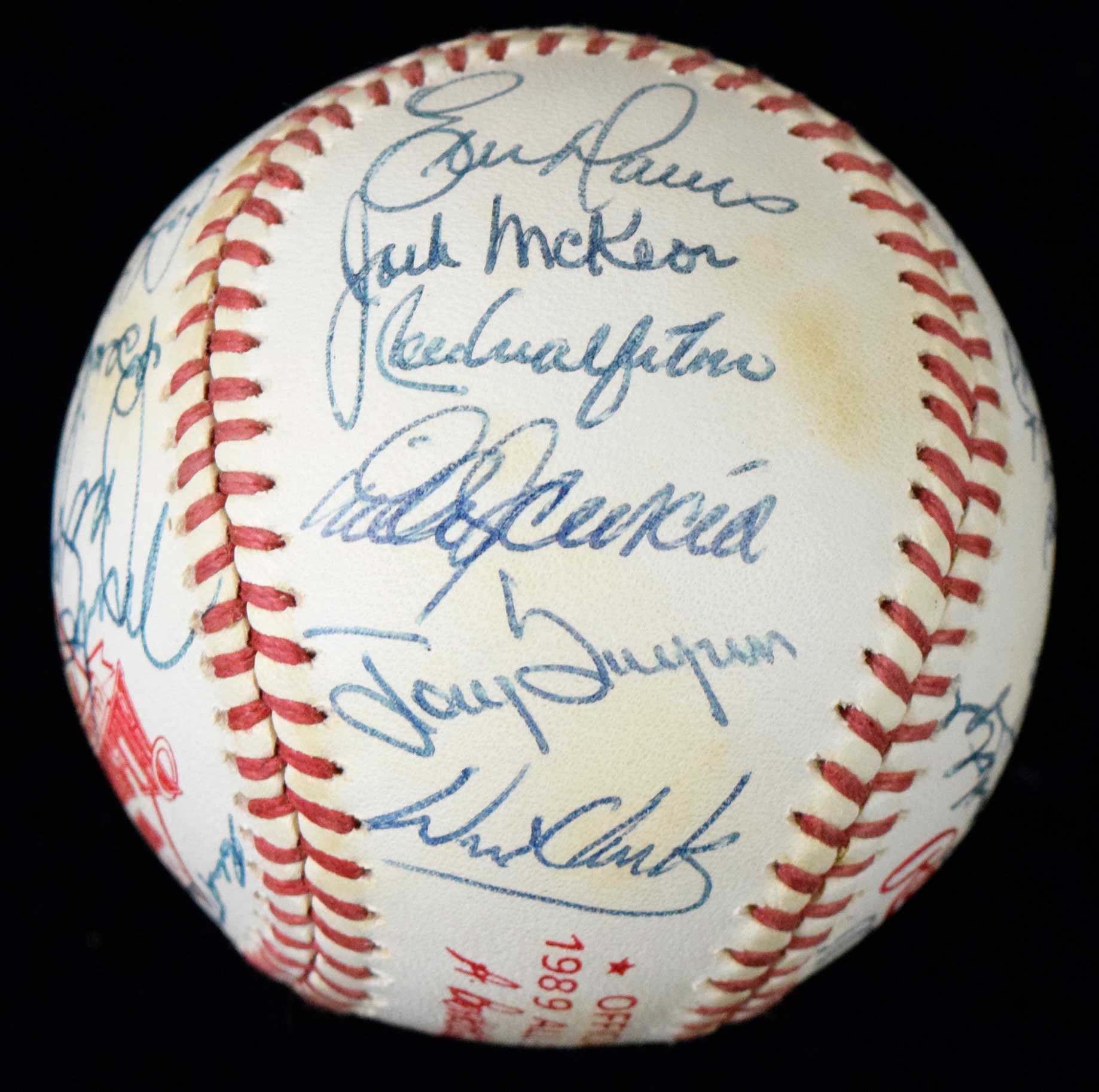 Description:1989 National League All-Star Team signed baseball (EX/MT-NM) Rawlings Official game logo ball has been signed by (27) incl. Larkin, Sandberg, Smoltz, Gwynn, Smith, and Dawson. Lasorda is clubhouse. Signatures rate 8 out of 10 and there is a touch of light toning: EX/MT-NM