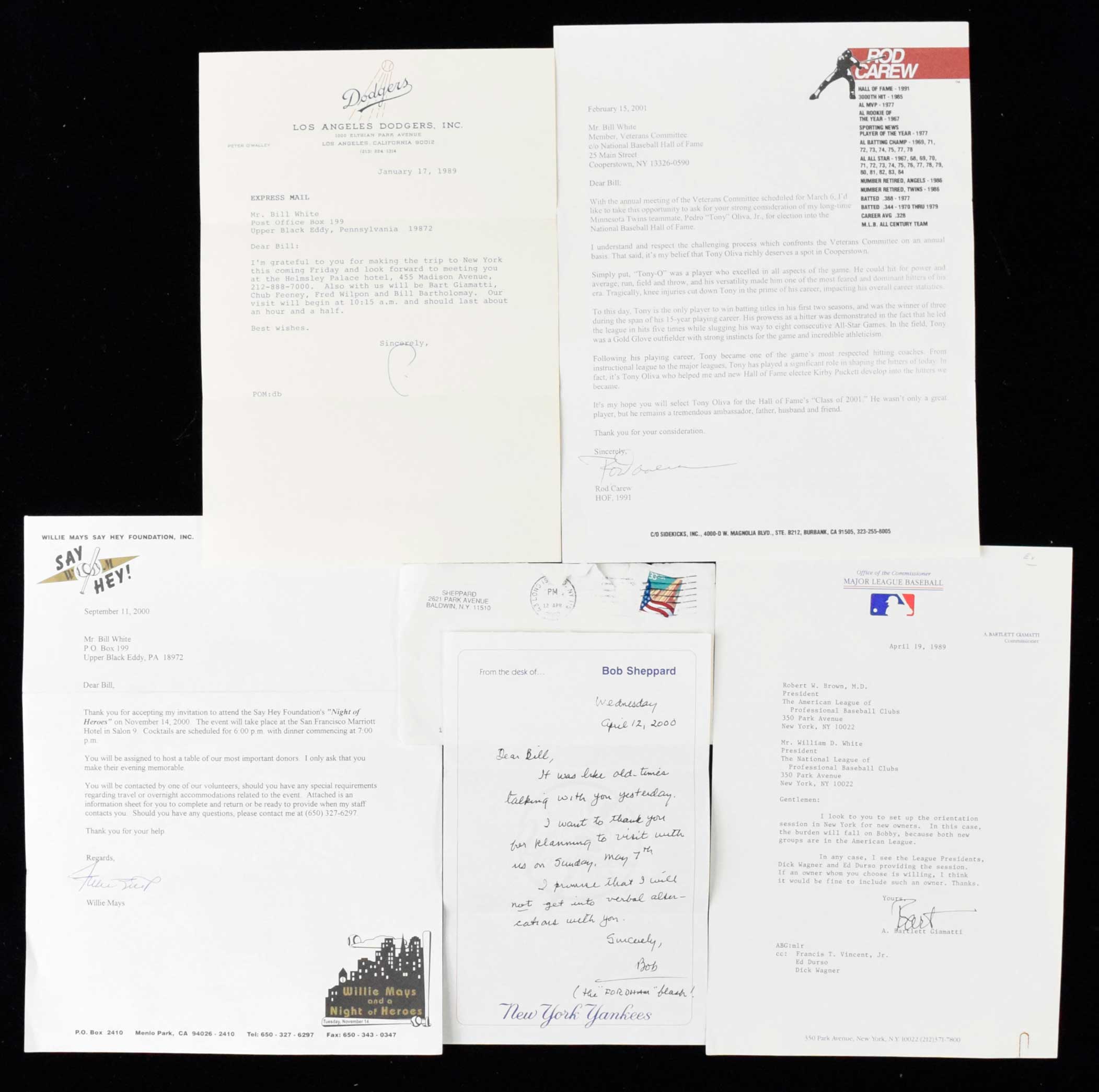 Description:Lot of (5) letters from the White Collection incl. Willie Mays, Rod Carew, and Bob Sheppard (EX-NM) Includes 2000 Willie Mays signed letter on Say Hey Foundation stationary regarding White attending a fundraising event; 1989 Bart Giamatti signed letter (first name only) of Commissioners' stationary regarding an upcomming meeting; 1989 Peter O'Malley signed letter (signed "P") regarding an upcomming meeting; 2001 Rod Carew signed letter on his personal stationary which was in support of Tony Oliva for election to the Baseball Hall of Fame; 2000 Bob Sheppard handwritten note on his personal stationary signed "Bob." Signatures rate 8 to 9 out of 10. Hint of light wear with typical mailing folds: EX-NM