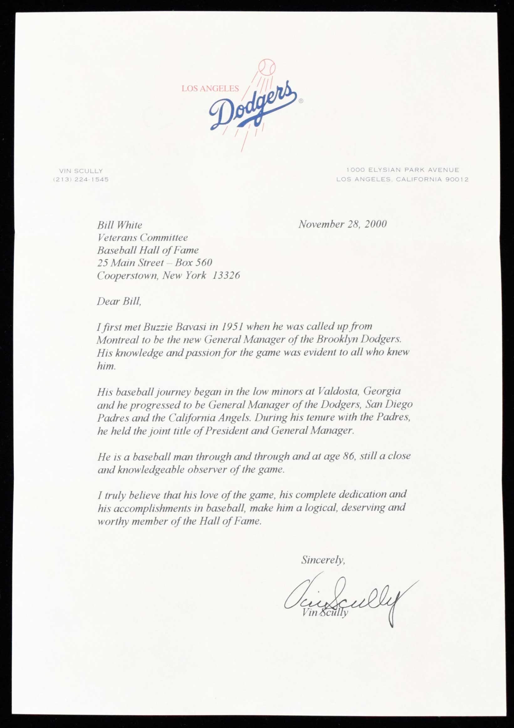 Description:2000 Vin Scully signed letter to Bill White (NM) Typed letter on Dodgers stationary written to White in his capacity as a member of the Hall of Fame Veterans Committee in support of Buzzie Bavasi for Hall of Fame consideration. Signed in black ink rating 9/10 out of 10. Typical fold lines from mailing: NM