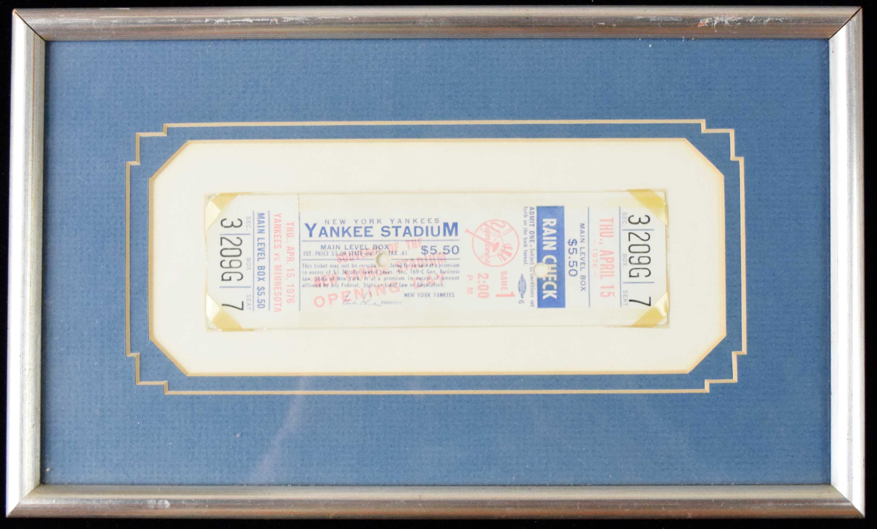 Description:Rare April 15, 1976 Yankee Stadium Opening Day full ticket (see description) Full ticket from the re-opening of Yankee Stadium after renovations displays scattered wear including a light crease. Rather than tear off the rain check portion, a hole was stamped in one edge to cancel it. There are very few full tickets which have surfaced from this game. Displayed in 7"x11.25" frame: see description