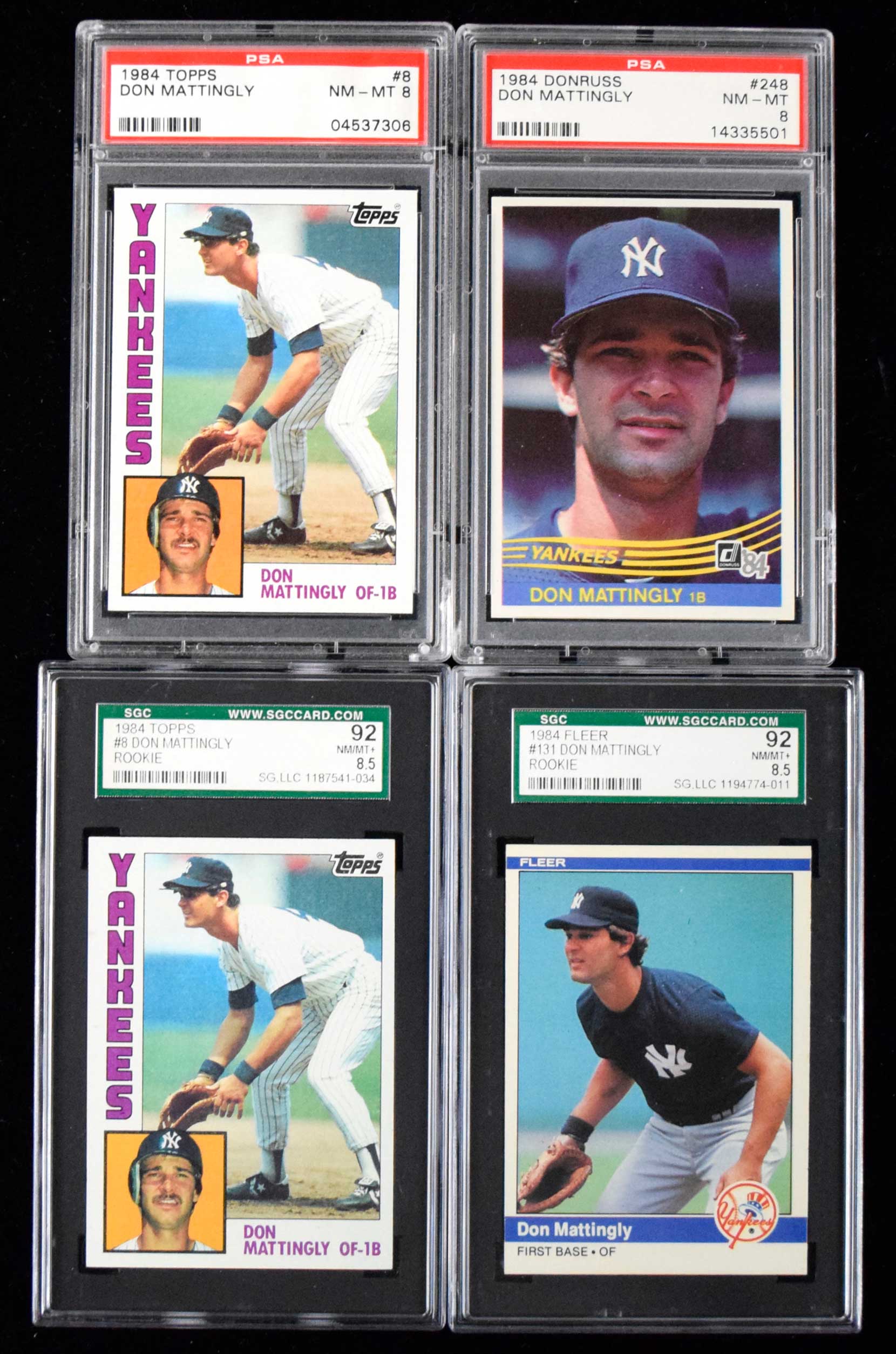 Lot of (7) 1984 Don Mattingly Rookie cards (graded) (see description) Includes 1984 Donruss #248 (PSA NM-MT 8); 1984 Fleer #131 (PSA EX-MT 6); 1984 OPC #8 (BCCG 9); 1984 Fleer #131 (BCCG 10); 1984 Topps #8 (PSA NM-MT 8); 1984 Topps #8 (SGC 92 NM/MT+); 1984 Fleer #131 (SGC 92 NM/MT+):