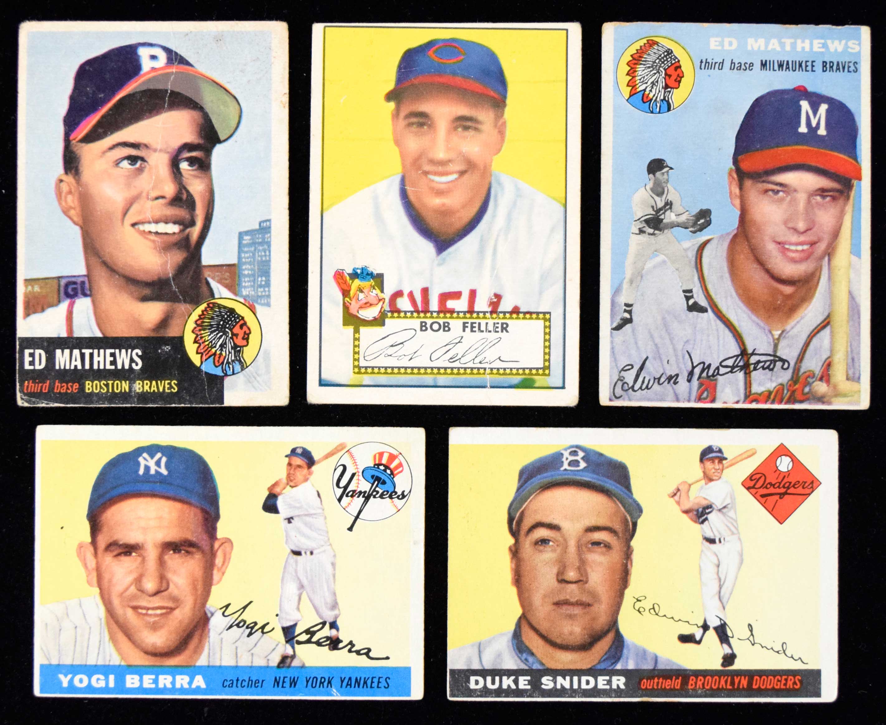 Lot of (152) 1952-1959 Topps Baseball cards incl. Hall of Famers (PR-VG) Includes (6) 1952 Topps incl. #88 Feller (GD); (21) 1953 Topps incl. #37 Mathews (FR/GD), 61 Wynn, 87 Lopat, 141 Reynolds, and 151 Wilhelm; (7) 1954 Bowman incl. #84 Doby (PR); (22) 1954 Topps incl. #30 Mathews (FR), 37 Ford (GD), and 102 Hodges; (46) 1955 Topps incl. #100 Irvin, 198 Berra (GD), 200 Jensen, and 210 Snider (GD); (26) 1957 Topps incl. #25 Ford (FR/GD); (19) 1958 Topps; and (5) 1959 Topps. Varying degrees/types of wear throughout with most cards in FR/GD-GD range: PR-VG
