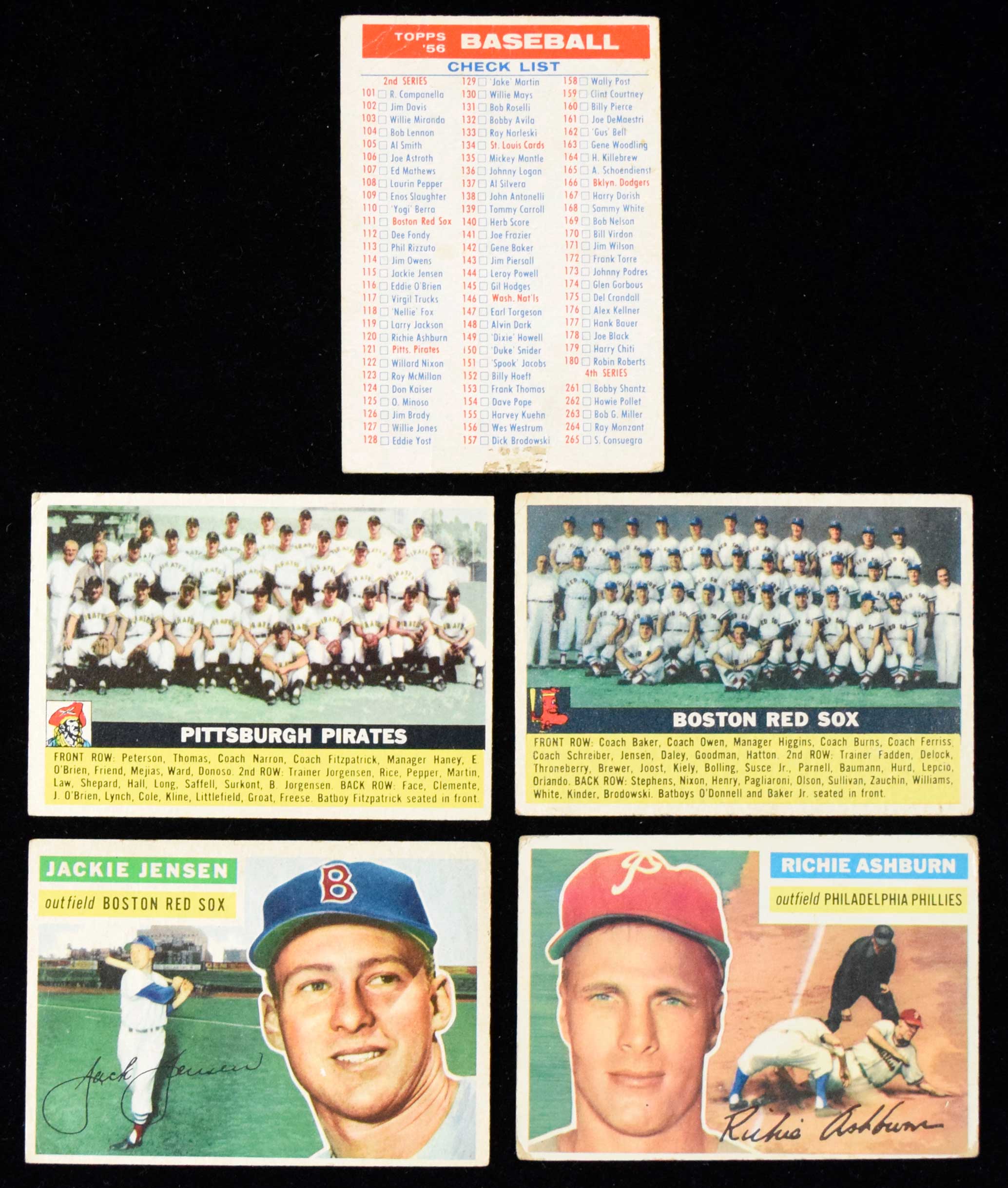 Description:Lot of (163) 1956 Topps baseball cards incl. HOFers, stars, and team cards (FR-VG) Varying degrees/types of wear throughout with FR-VG general range and average card around GD. Includes checklist, (2) Richie Ashburn, Enos Slaughter, Jackie Jensen, Red Schoendienst, Warren Giles, Walt Alston, Mickey Vernon, Johnny Kucks, Jerry Coleman, Sandy Amoros, Gil McDougald, Dick Groat, Don Larsen, and Don Newcombe. Team cards incl. Indians, Giants, Cardinals, Phillies, Pirates, (2) Red Sox, Nationals, Orioles, and Reds: FR-VG