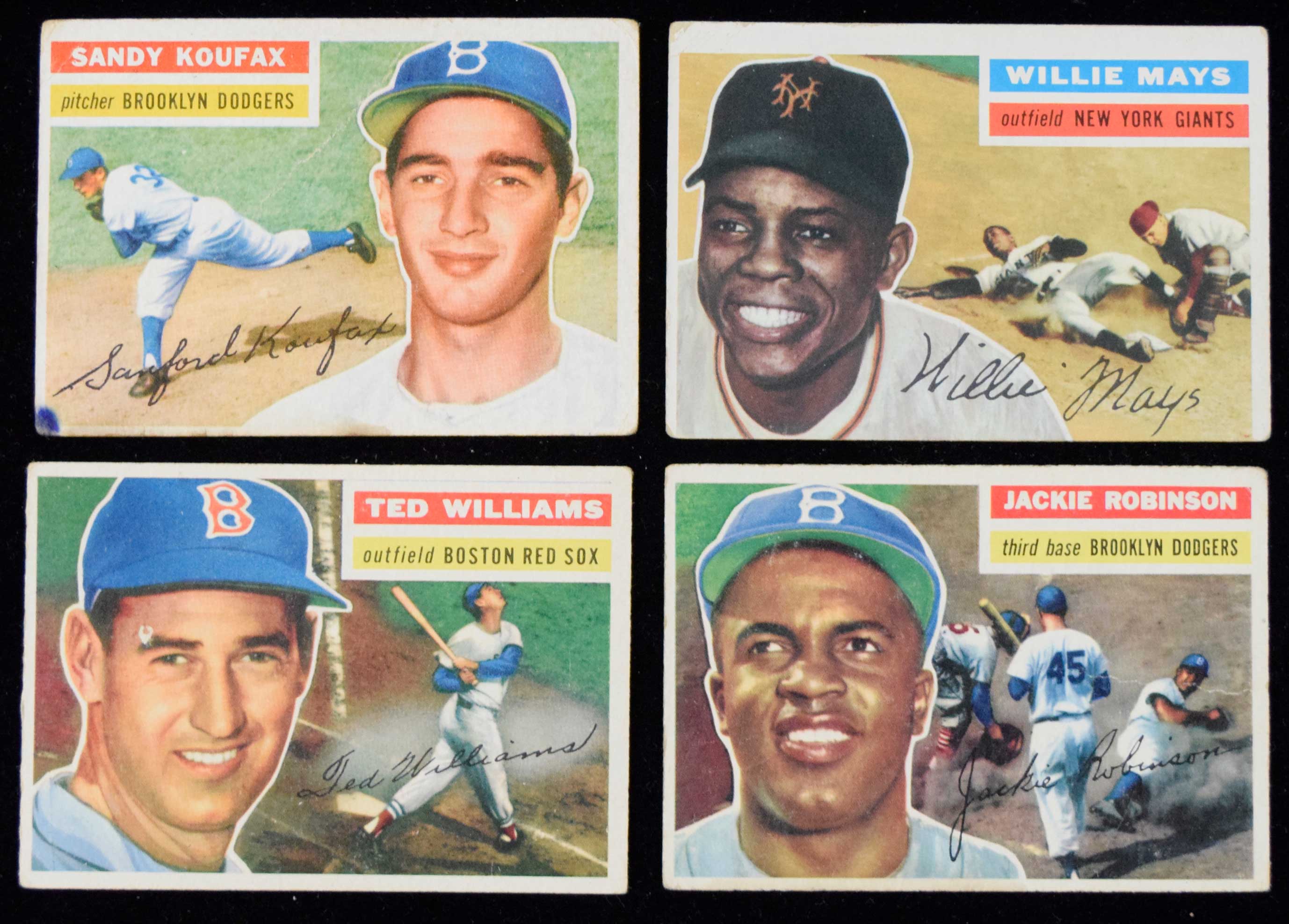 Description:Lot of (12) 1956 Baseball Hall of Famers incl. Robinson, Williams, Koufax, and Mays (PR-VG) Includes VG condition #5 Williams and 10 Spahn; GD condition #30 Robinson, 110 Berra, 164 Killebrew, and 180 Roberts; PR to FR condition #20 Kaline(2) and 79 Koufax; and miscut cards of #101 Campanella, 118 Fox, and 130 Mays: PR/FR-VG