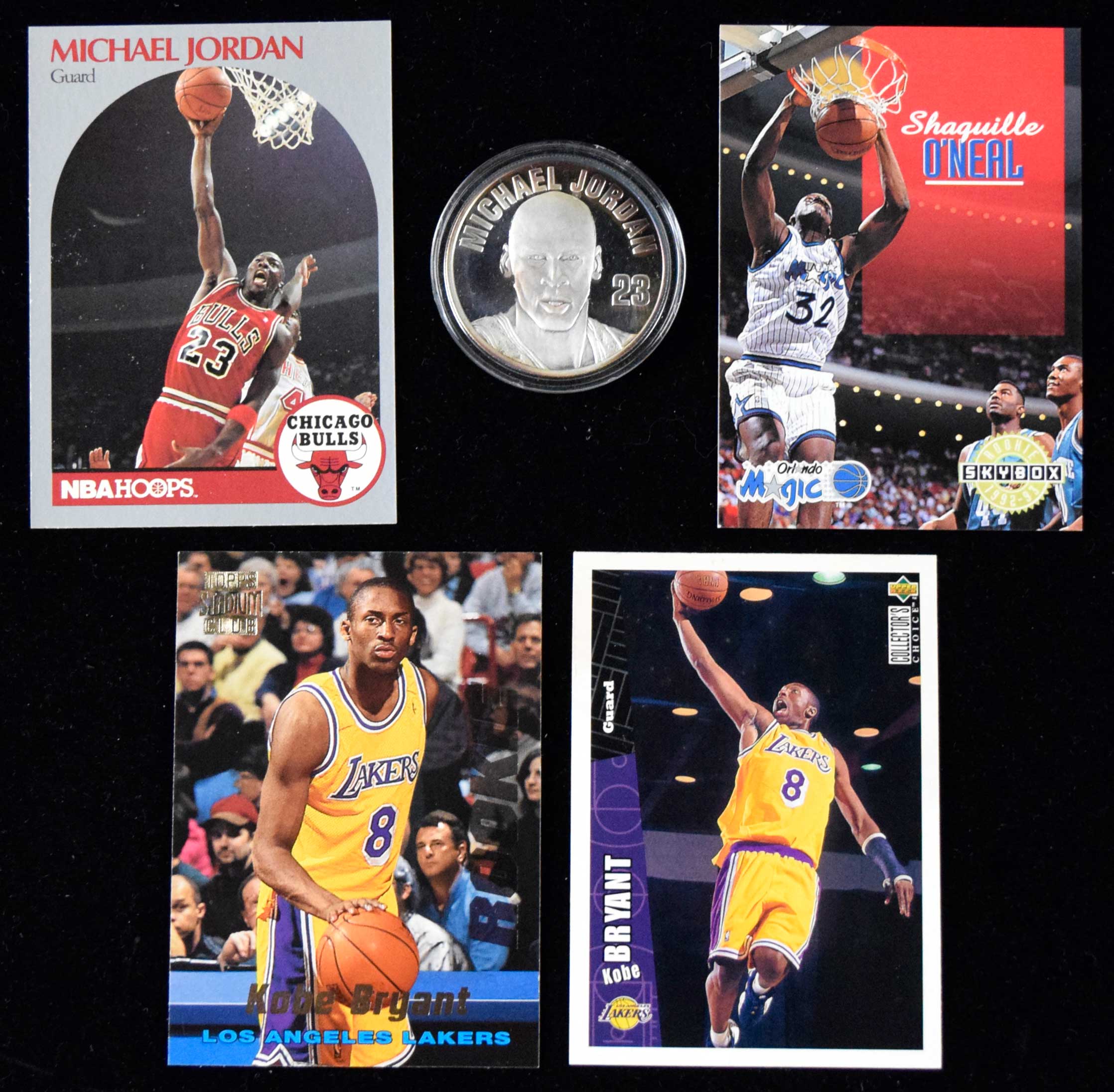 Description:Michael Jordan, Kobe Bryant, and Shaquille O'Neal card lot plus (1) ounce Jordan coin (EX-NM) Includes Michael Jordan (1) ounce silver commemorative coin (some tarnish); Kobe Bryant Collectors Choice (#267) and Stadium Club (#R12) Rookies; (6) assorted Shaquille O'Neal Rookies; Allen Iverson Fleer Ultra (#82) Rookie; (18) assorted 1990s or early 2000s Michael Jordan cards; 1997-98 Michael Jordan Skybox Z-Force card in WCG grading holder; Michael Jordan (3) metal coin commemorative set. Varying degrees of wear throughout: EX-NM