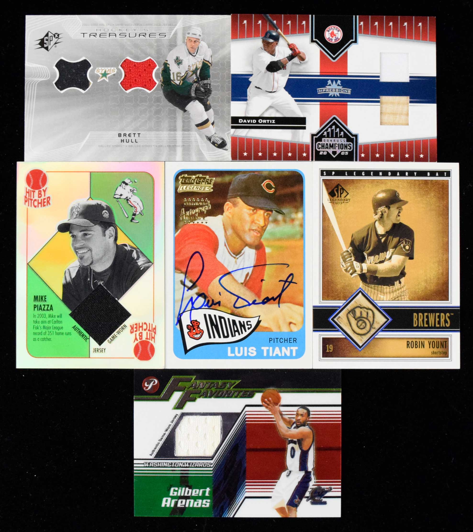 Description:Lot of approx. (240) modern mixed sports relic or autographed insert cards (EX-NM) Majority are relic cards with some autographed mixed in. Those mentioned are on relic cards unless noted. Notables incl. Joe Morgan, Jeff Bagwell, Mike Piazza, Pedro Martinez, Brett Hull, Ivan Rodriguez, David Ortiz, Steve Largent, Luis Tiant (auto), Larry Walker, Mike Modano, Robin Yount, Gary Payton, Gilbert Arenas, Kordell Stewart, David Carr, Kris Humphries (auto), and Mats Sundin. Most in average NM condition with EX-NM general range: EX-NM