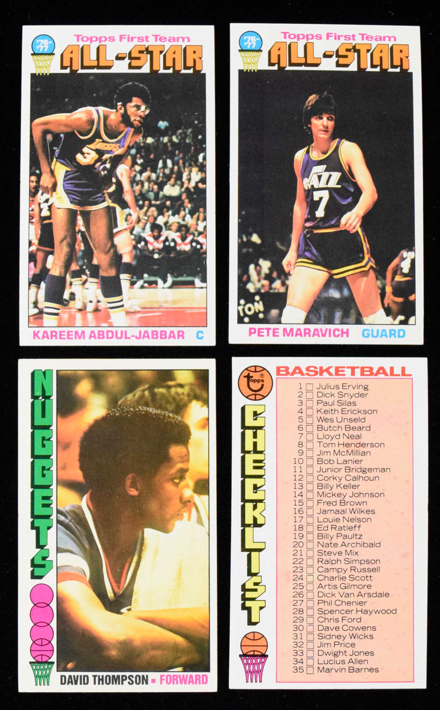 Description:Lot of approx. (375) 1976-77 Topps Basketball cards with some higher grade (VG-NM) Large lot of mixed condition cards with most EX or better (small portion grade lower) and there are around (100) which are higher grade (avg. NM). Many Hall of Famers including at least (2) David Thompson, (5) Rick Barry, (3) Elvin Hayes, George Gervin, (3) John Havlicek, (2) Elvin Hayes, (2) Earl Monroe, Walt Frazier, Pete Maravich All Star, Adbul-Jabbar All Star, and (2) Julius Erving All Star.