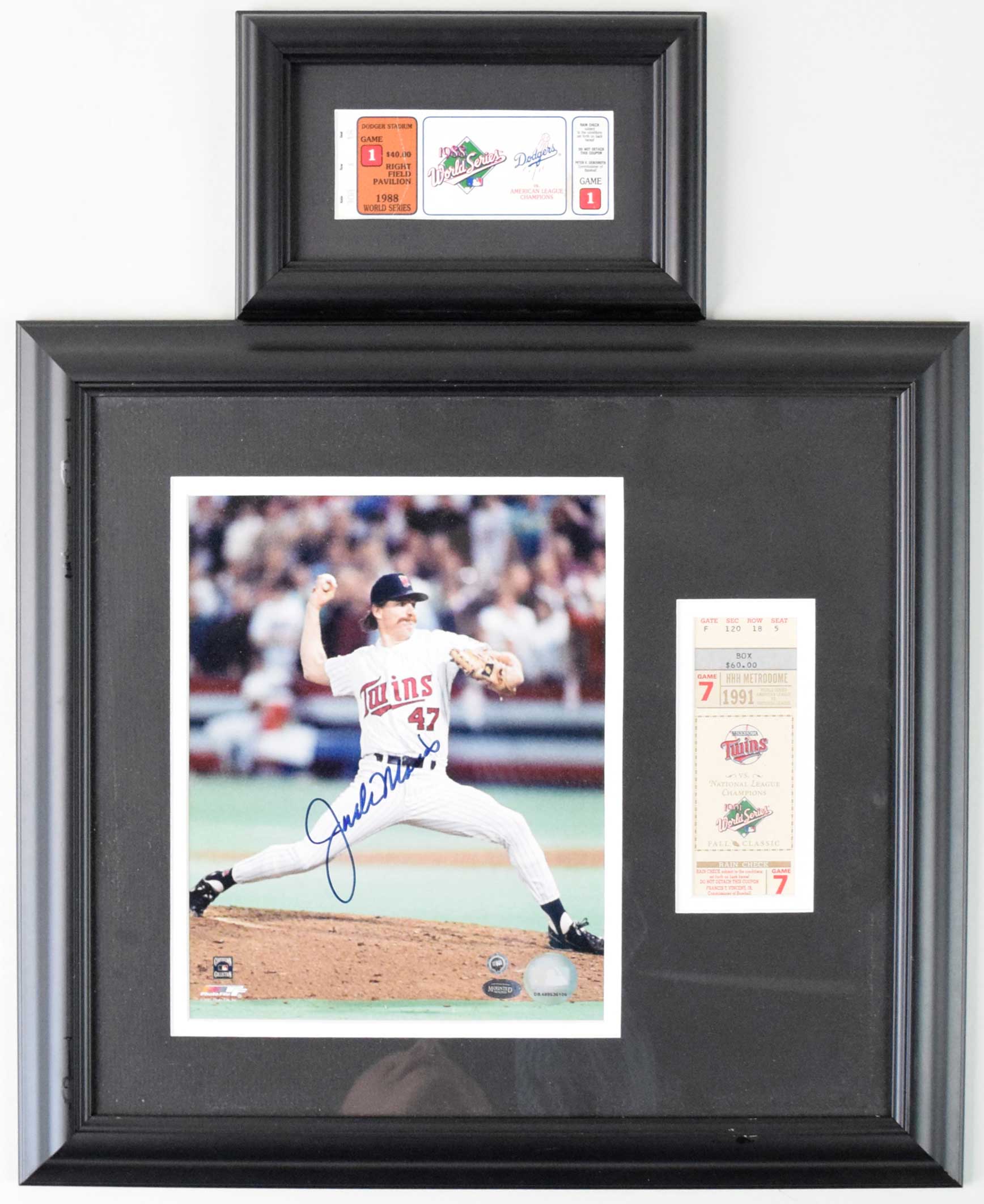 Description:1988 and 1991 (signed by Jack Morris) framed World Series ticket displays (VG-NM). Includes 1988 World Series Game 1 ticket stub (Kirk Gibson HR, framed, VG appearance due to visible crease); and 16.5"x18" framed display containing 1991 World Series Game 7 ticket stub matted next to a photo signed by Jack Morris in blue marker rating 9 out of 10 (MLB Authenticated, NM appearance).