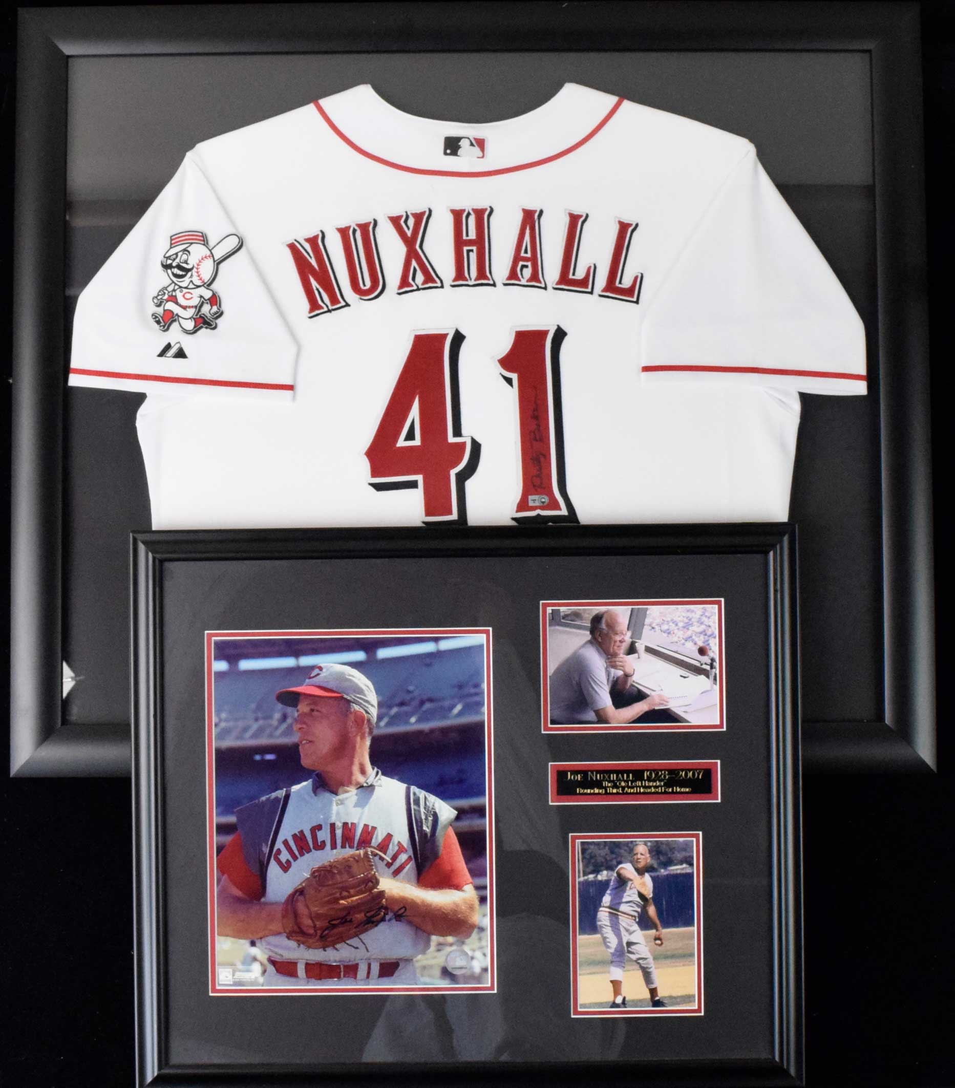 Description:Lot of (3) Joe Nuxhall framed display pieces (NM-NM/MT). Includes 31"x36.5" framed Cincinnati Reds #41 Joe Nuxhall jersey worn by Dusty Baker during pre-game ceremonies on 3/31/2008 in honor of Nuxhall and signed by Baker in black marker rating 8 out of 10 (MLB Authenticated); 23.5"x29.5" framed "Joe Nuxhall vs. Stan Musial" print; and 22"x26" framed Joe Nuxhall display containing a photo signed by Nuxhall in black marker rating 9 out of 10. Due to framing, complete conditions are unknown: NM-NM/MT appearance