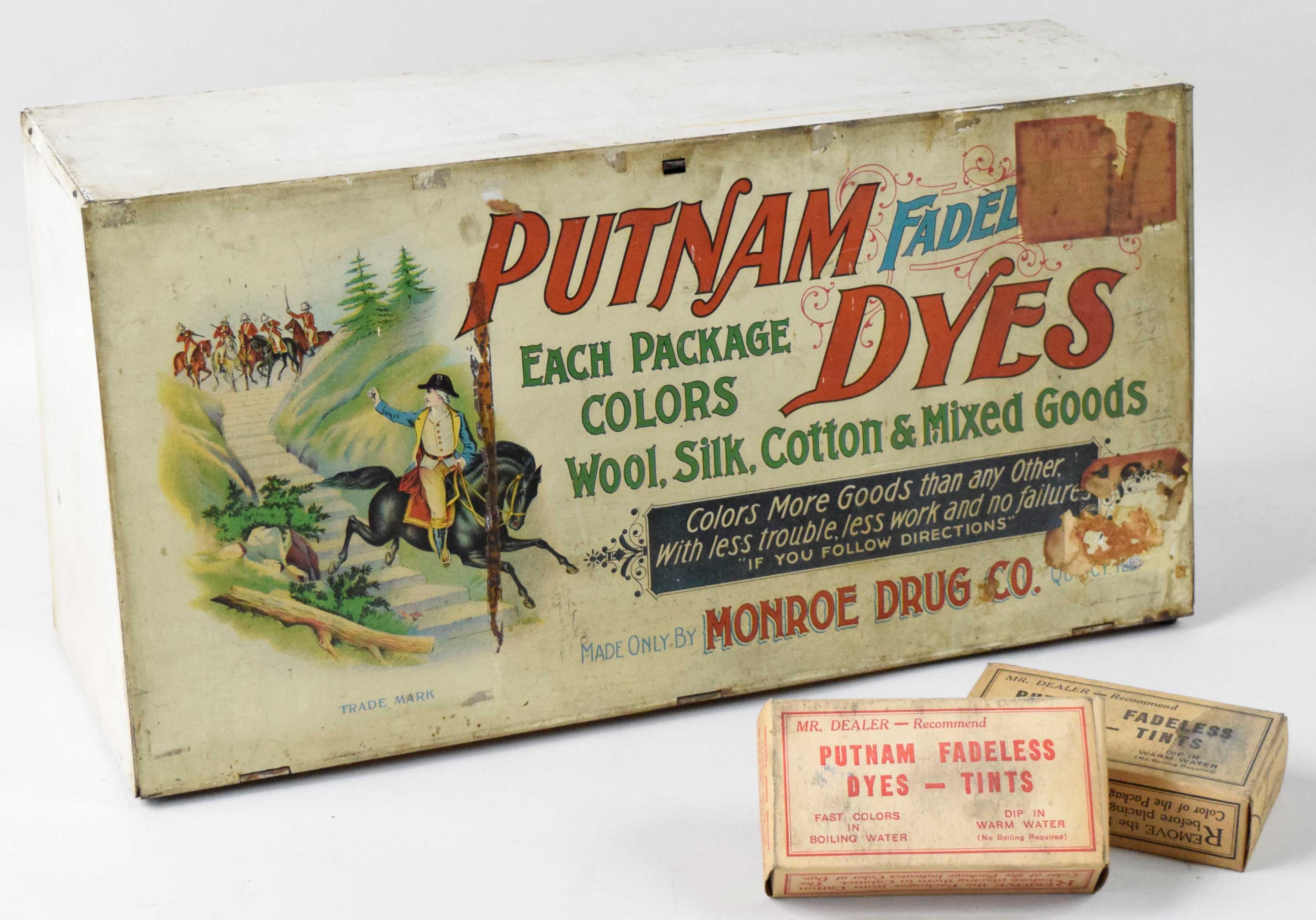 Description:Monroe Drug Co. Putnam Fadeless Dies metal store display box, c.1920s (VG/EX). Measures approx. 8"x11"x22", with door which opens to display the boxes of dyes (two boxes still inside). Normal age, handling, and storage wear with discoloration, pencil notations, and remnants of the company labels: VG/EX