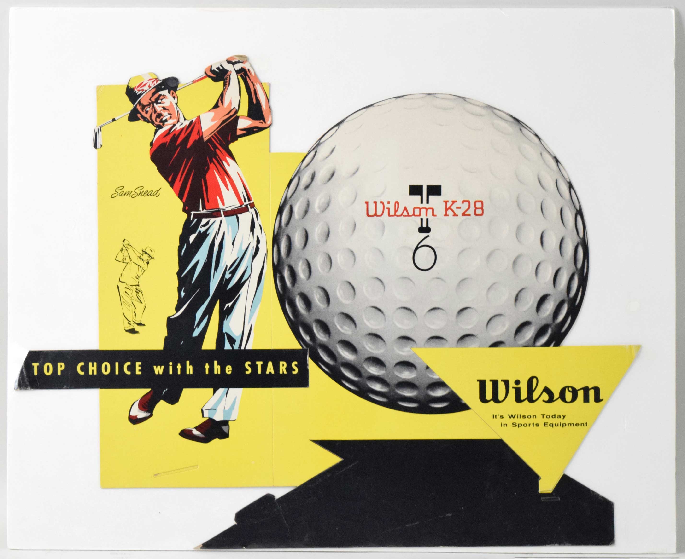 Description:Sam Snead vintage Wilson store display sign, c.1940s-50s (EX). Approx. 20"x25.5" cardboard die-cut store display in flattened form (would have been folded and connected at the base to stand up in a store). Wear is mainly confined to the tips which have some creasing: EX