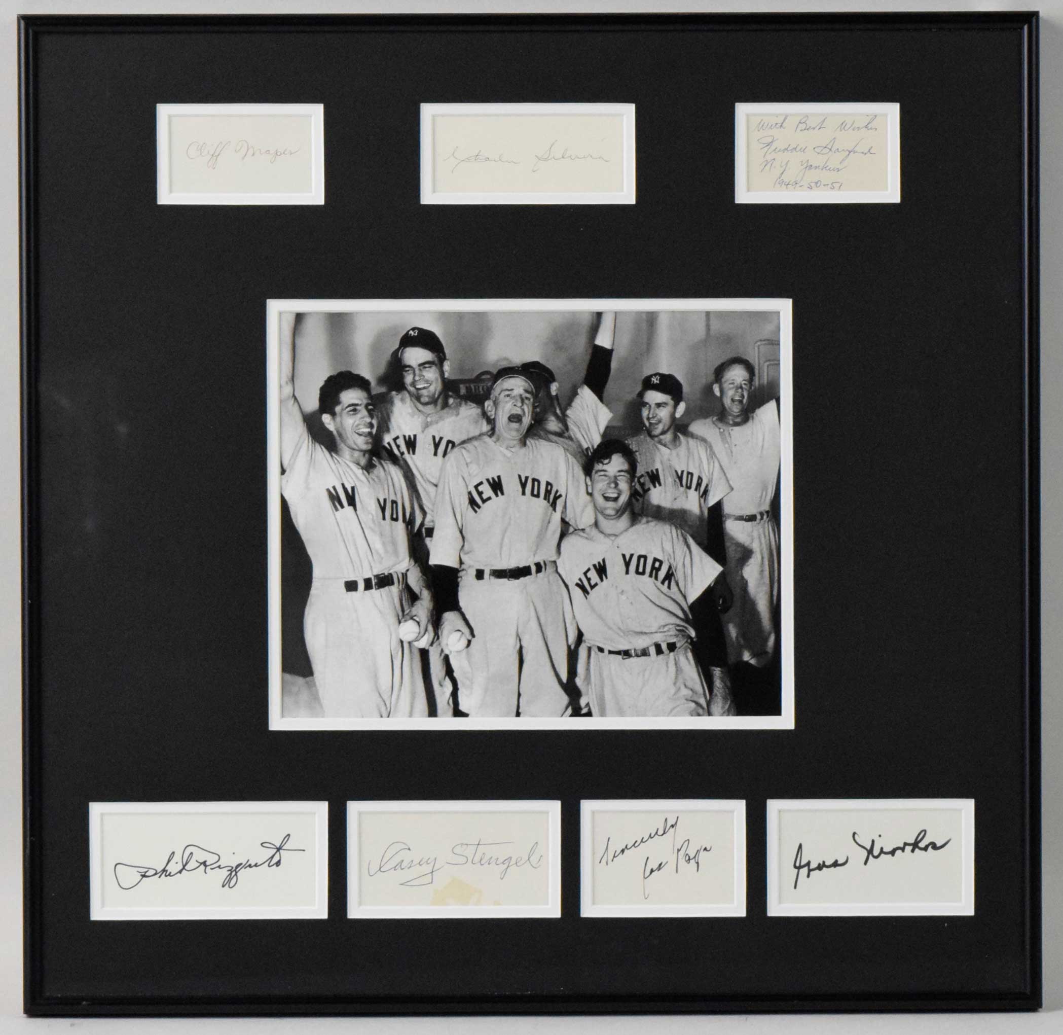 Description:1949 New York Yankees display with (7) autographs (EX-NM) Framed display (21.25"x21") includes a black and white image of the Yankees 1949 World Series Victory locker room celebration. Matted at the top and bottom are signatures from (7) of those shown incl. Casey Stengel, Phil Rizzuto, Gus Niarhos, Fred Sanford, Charlie Silvera, Cliff Mapes, and Joe Page (note - Page might be secreterial). Signatures rate 7 to 9 out of 10: EX-NM