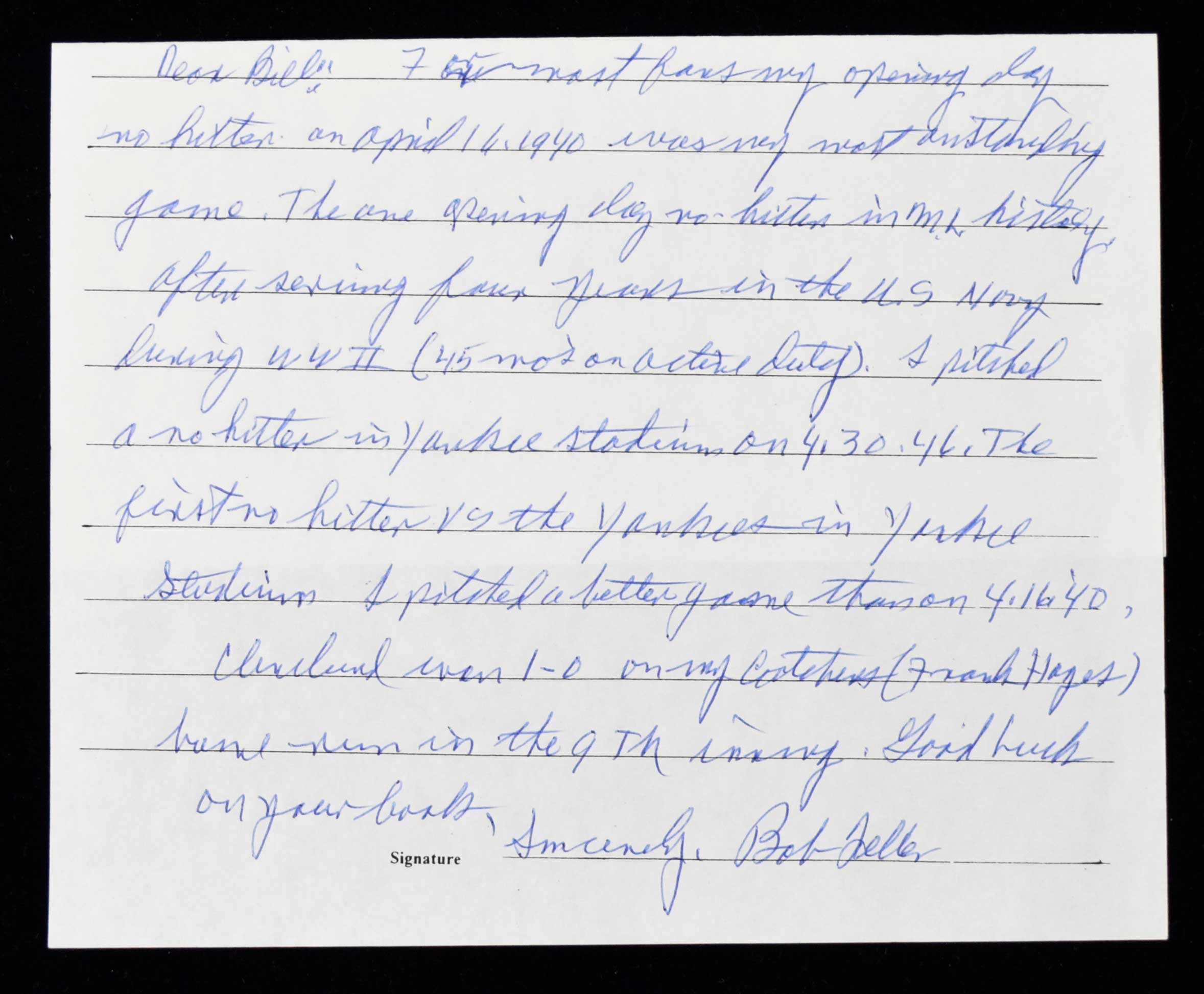 Description:Bob Feller "Greatest Thrill" handwritten letter with no-hitter content (EX-NM) Handwritten letter from Bob Feller in response to a fan asking what his "greatest thrill - most memorable moment in baseball was." Feller makes mention of his Opening Day no-hitter in 1940, 1946 no-hitter in Yankee Stadium, and his military service. Handwriting and signature rate 8 to 9 out of 10. Touch of light wear with typical mailing folds: EX-NM