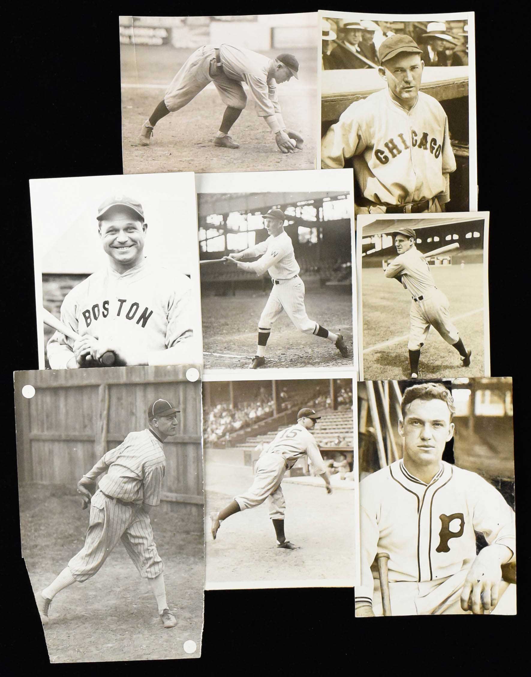 Description:Lot of (10) c.1910s-30s Hall of Famer photographs incl. Hornsby and Foxx (GD-EX) Includes images of Rogers Hornsby (1929 dated paper caption and Associated Press stamp on back); Jimmie Foxx (Wide World stamp on back and faded paper caption dated 1938 is included but not attached); Joe Sewell (1921 dated paper caption and "International" stamp on back); Arky Vaughan (1935 date stamp on back); Red Faber (with NEA and 1918 date stamps on back) (missing section from lower corner); Leo Durocher (American League Service Bureau stamp and 1930 handwritten date); Red Ruffing with Associated press stamp and 1932 date stamp; and Sam Rice with 1930 date and Associated Press stamps. Most around 6"x8" with Faber largers. Varying degrees/types of wear throughout: GD-EX