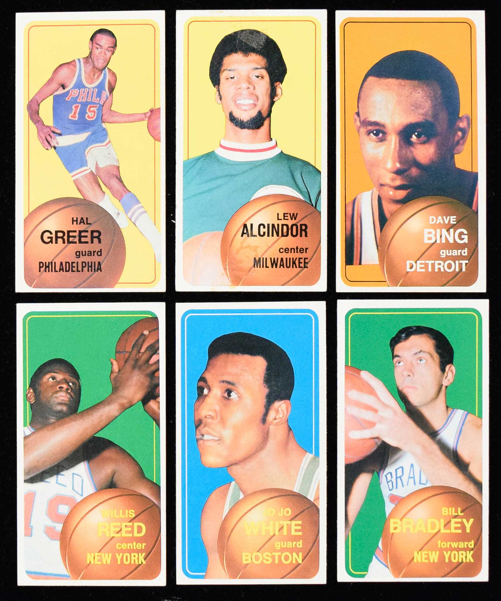 Description:Lot of (11) HOFers 1970-71 Topps Basketball cards (PR-NM). Includes #s 7 Bill Bradley (EX-EX/MT), 57 Al Attles (VG/EX-EX miscut), 75 Lew Alcindor (PR), 110 Willis Reed (trimmed top edge), 112 John Havlicek (GD-G/VG), 125 Dave Bing (NM oc), 143 Jo Jo White (EX/MT-NM), 150 Reed (EX/MT), 155 Hal Greer (EX/MT oc), 170 Dave DeBusschere (trimmed right edge), and 172 Bradley (EX-EX/MT).