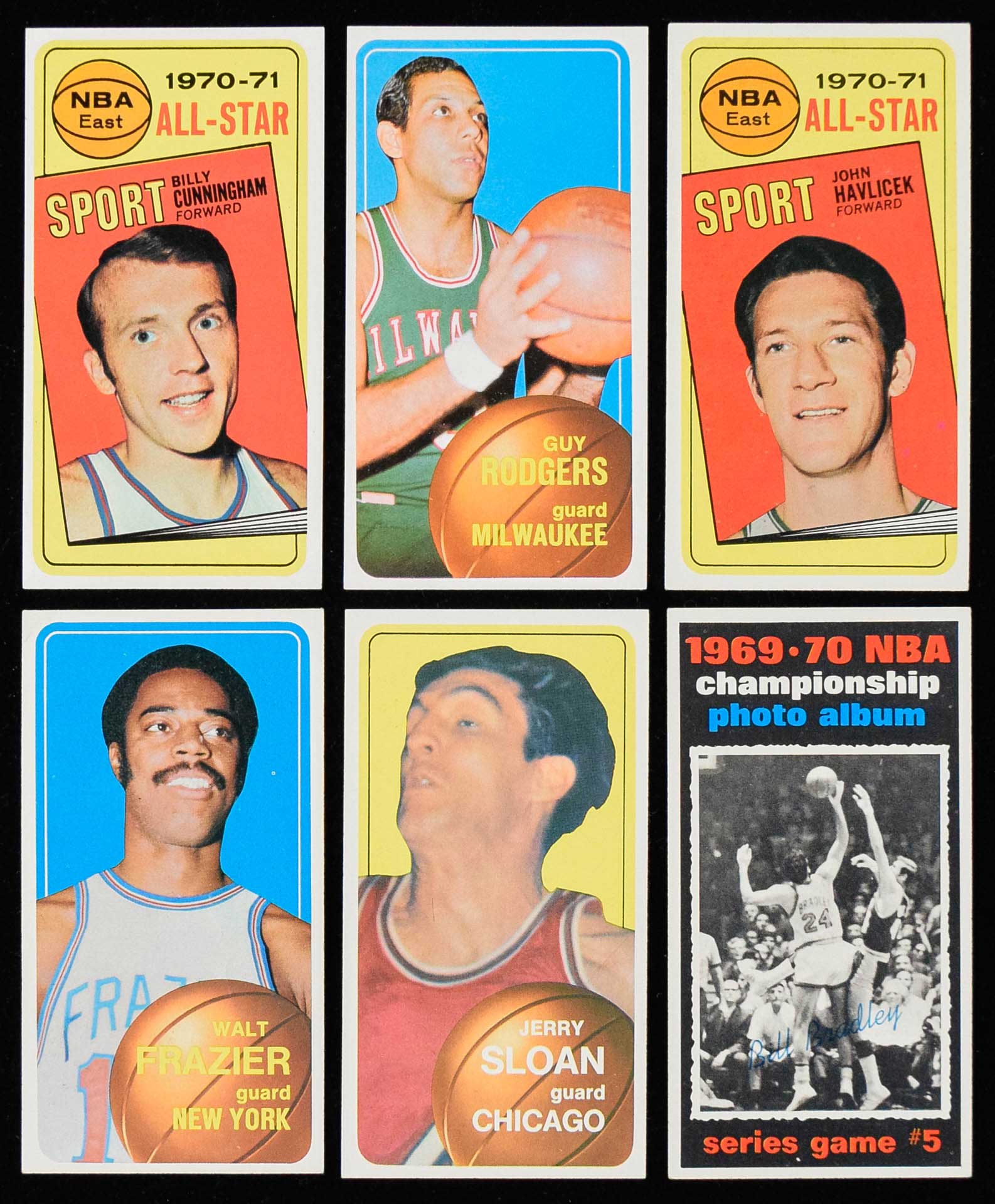 Description:Lot of (11) HOFers 1970-71 Topps Basketball cards (see description). Includes #s 22 Guy Rodgers (EX/MT oc), 72 Wes Unseld (likely trimmed), 108 Billy Cunningham (VG), 112 John Havlicek (VG/EX), 120 Walt Frazier (VG), 140 Cunningham (trimmed), 148 Jerry Sloan (NM), 155 Hal Greer (likely trimmed), 170 Dave DeBusschere (trimmed), 172 Bill Bradley (EX/MT), and 174 Frazier (likely trimmed).