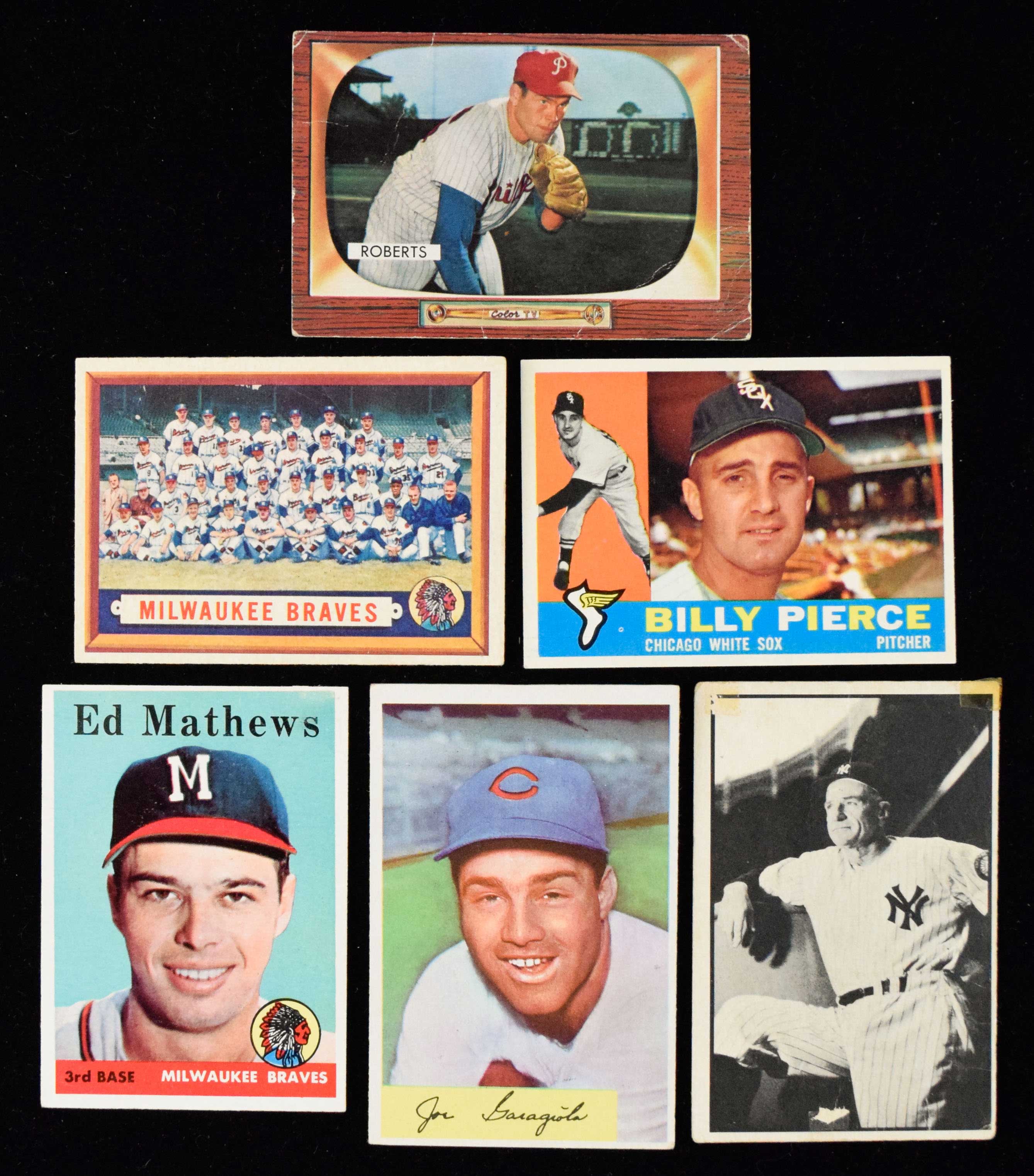 Description:Lot of (102) baseball cards from 1953-1960 including HOFers (PR-NM). Includes 1953 Bowman B&W #39 Casey Stengel (PR); 1953 Bowman Color #s 28 and 60; (13) 1954 Bowman; (30) 1955 Bowman including #s 38 Early Wynn (PR), 130 Richie Ashburn (PR), (2) 171 Robin Roberts (PR-GD); 1957 Topps #114 Milwaukee Braves team (VG); (9) 1958 Topps including #s 310 Ernie Banks (VG), 440 Mathews (VG), 464 Flood rookie (EX/MT oc); and (47) 1960 Topps (avg VG/EX-EX overall). Other than the 1960 Topps, most cards appear to average FR/GD-GD overall. Range: PR-NM