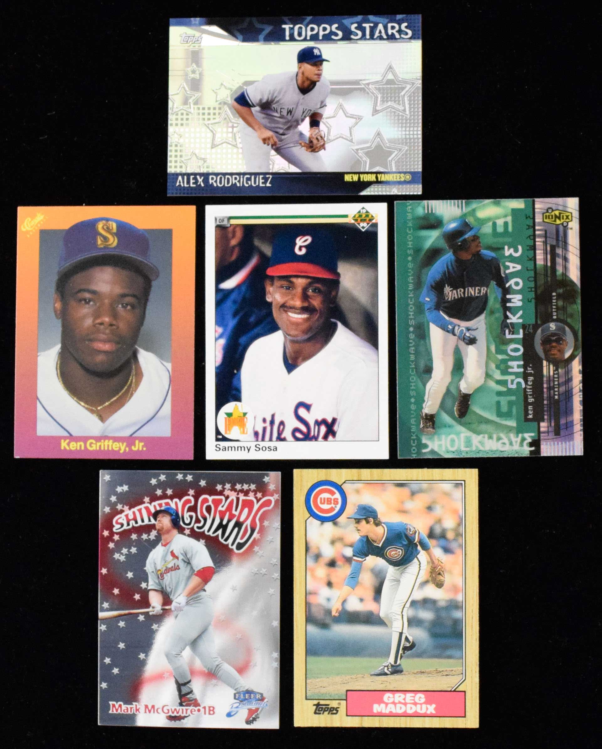 Description:Nice lot of (380) stars & HOFers baseball cards from 1987 into the 2000s (VG/EX-NM/MT). Includes (68) Greg Maddux, (120) Ken Griffey Jr, (95) Mark McGwire, (44) Alex Rodriguez, and (53) Sammy Sosa. Various conditions throughout the lot, but most appear to average NM overall. Range: VG/EX-NM/MT