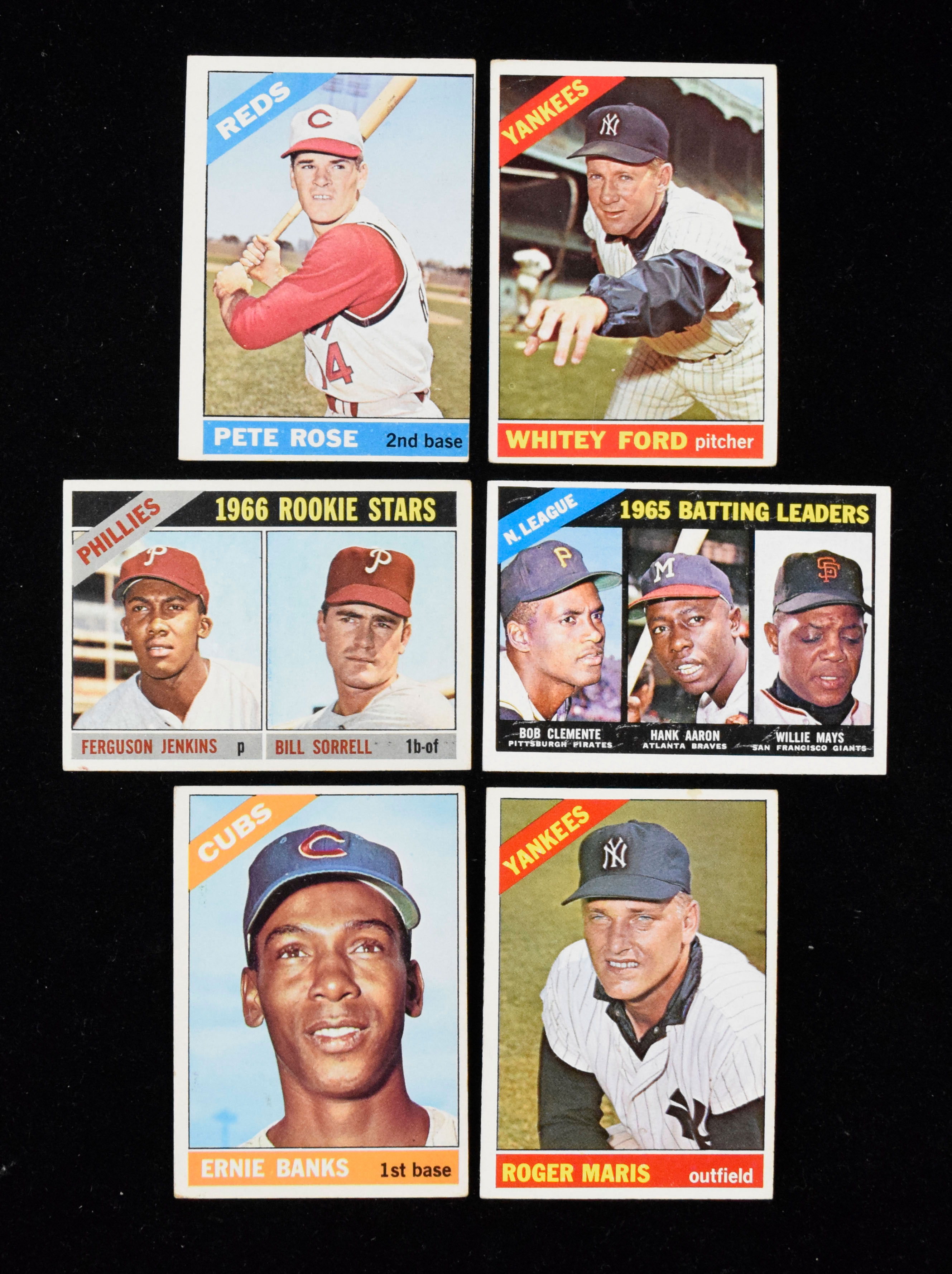 Description:"Lot of (44) 1966 Topps cards, loaded with stars and HOFers (GD-EX). Outstanding lot of classic 1966 Topps cards is chock full of numerous stars, including #30 Pete Rose, #36 Catfish Hunter, #91 Bob Uecker, #72 Tony Perez, #92 Yankees team card, #110 Ernie Banks, #160 Whitey Ford, #120 Harmon Killebrew, #132 Orlando Cepeda, #195 Joe Morgan, #200 Eddie Mathews, #215 Willie Mays/Roberto Clemente/Hank Aaron LDR and (10) other LDR cards, #320 Bob Gibson, #254 Fergie Jenkins RC, #365 Roger Maris, #390 Brooks Robinson, #234 Roy White RC and more. Lot has minor duplication, and most card appear VG/EX. Range: GD-EX. "