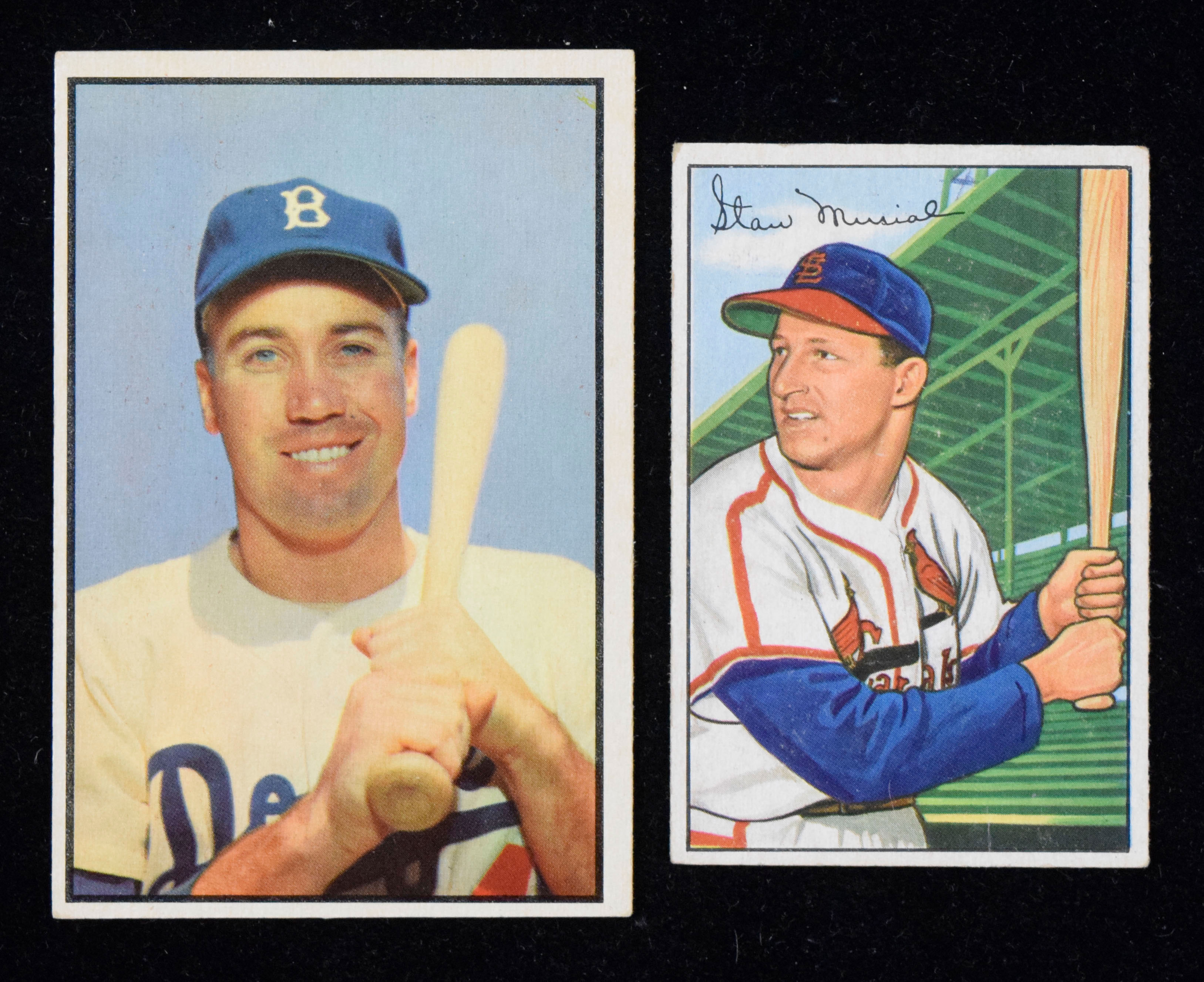 Description:"1952 Bowman #196 Stan Musial and 1953 Bowman Color #117 Duke Snider (VG). Outstanding lot of two classic early Bowman cards, with cards appearing better than technical grades but downgraded due to hairline creases. Includes 1952 #196 Musial (VG) and 1952 #117 Snider (VG). "