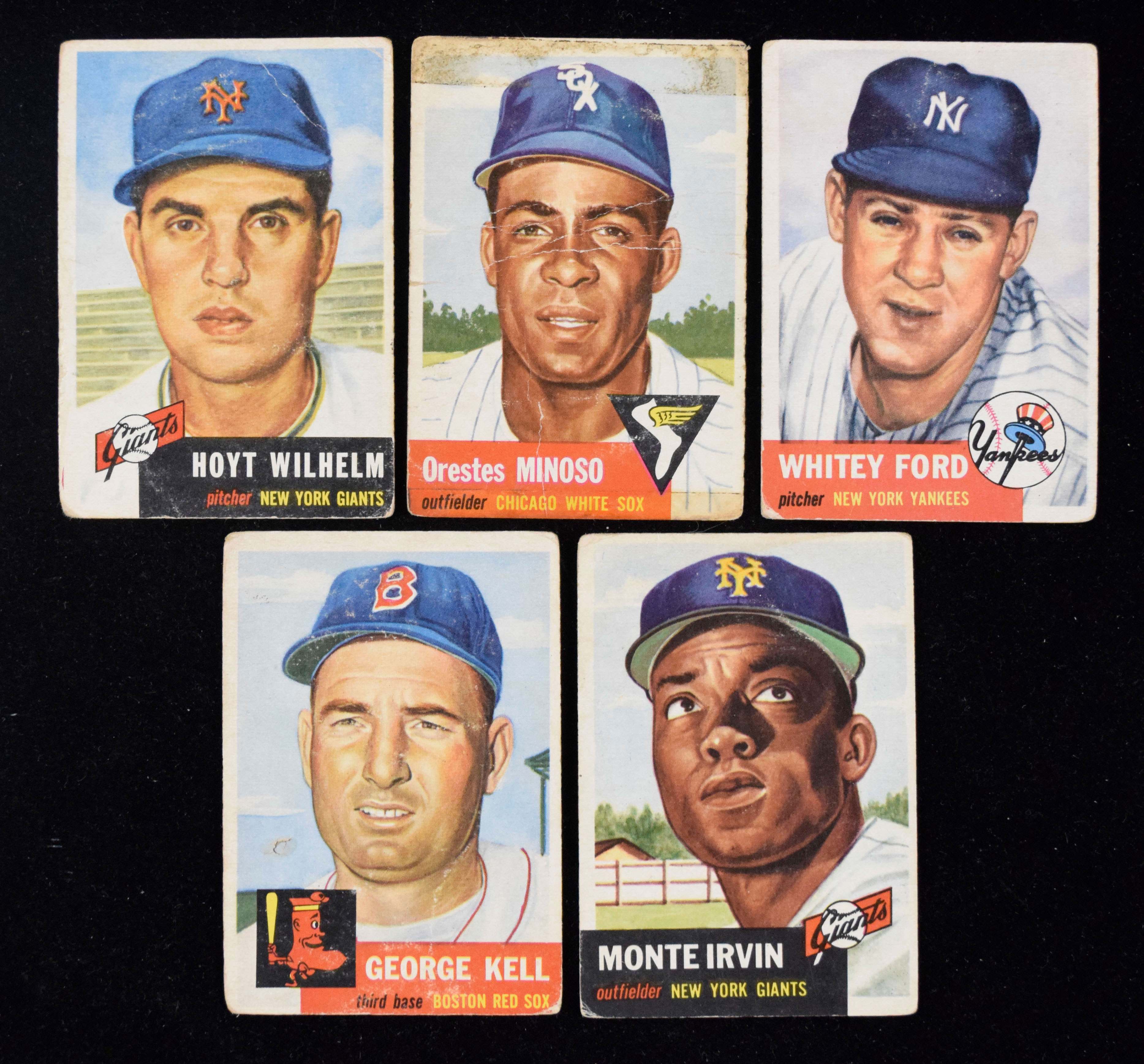Description:"Lot of (5) 1953 Topps HOFers, including Whitey Ford and Monte Irvin (PR-GD). Low-grade lot includes #62 Monte Irvin (GD), #66 Minnie Minoso (PR, tape residue), #138 George Kell (PR), #151 Hoyt Wilhelm (PR) and #207 Whitey Ford (GD). Range: PR-GD. "