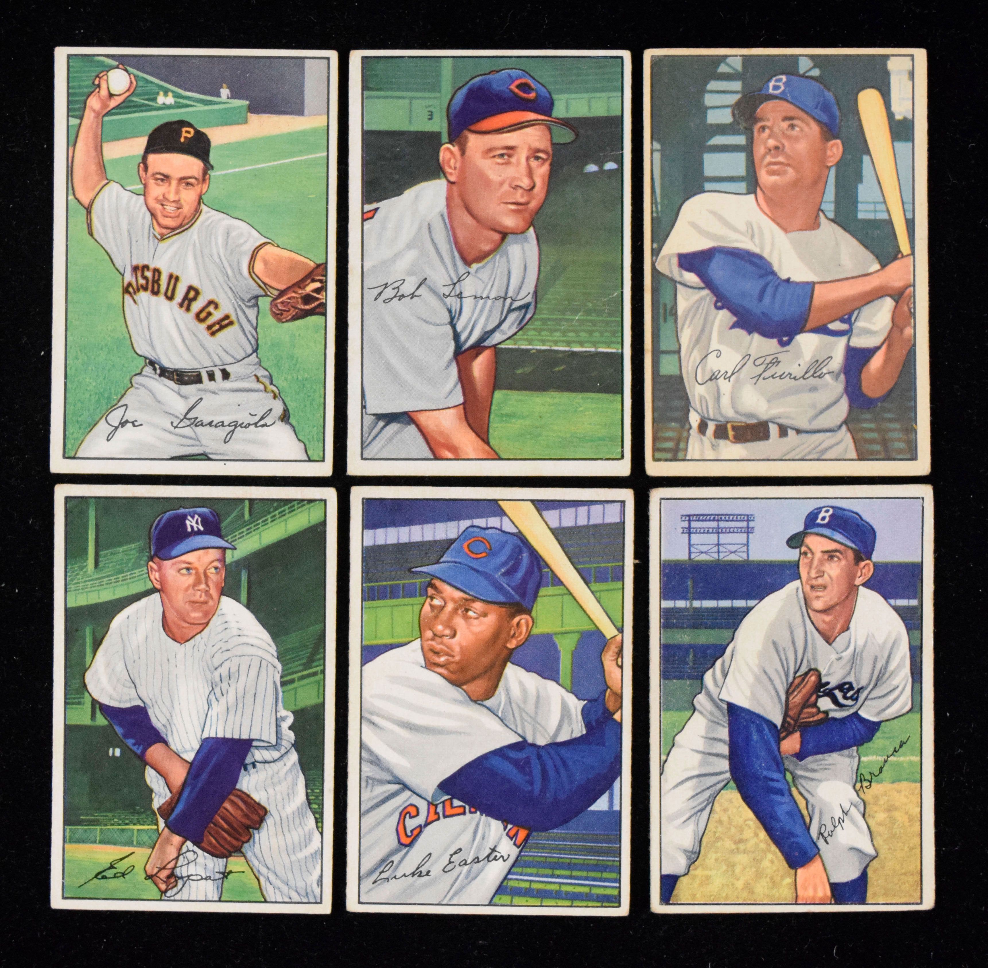 Description:"Large lot of (205) 1952 Bowman cards with minor stars and many duplicates (PR-VG/EX). Nice quantity of classic 1952 Bowman cards is in numeric order spanning card #s 7-197, with heavy duplication. In some cases, there are (4) or more of one card. Highlights include #17 Ed Lopat, #23 Bob Lemon, #24 Carl Furillo, (4) #27 Joe Garagiola, (3) #54 Billy Pierce, (2) #95 Luke Easter, (3) #96 Ralph Branca and more. Most cards appear GD-VG. Range: PR-VG/EX. "