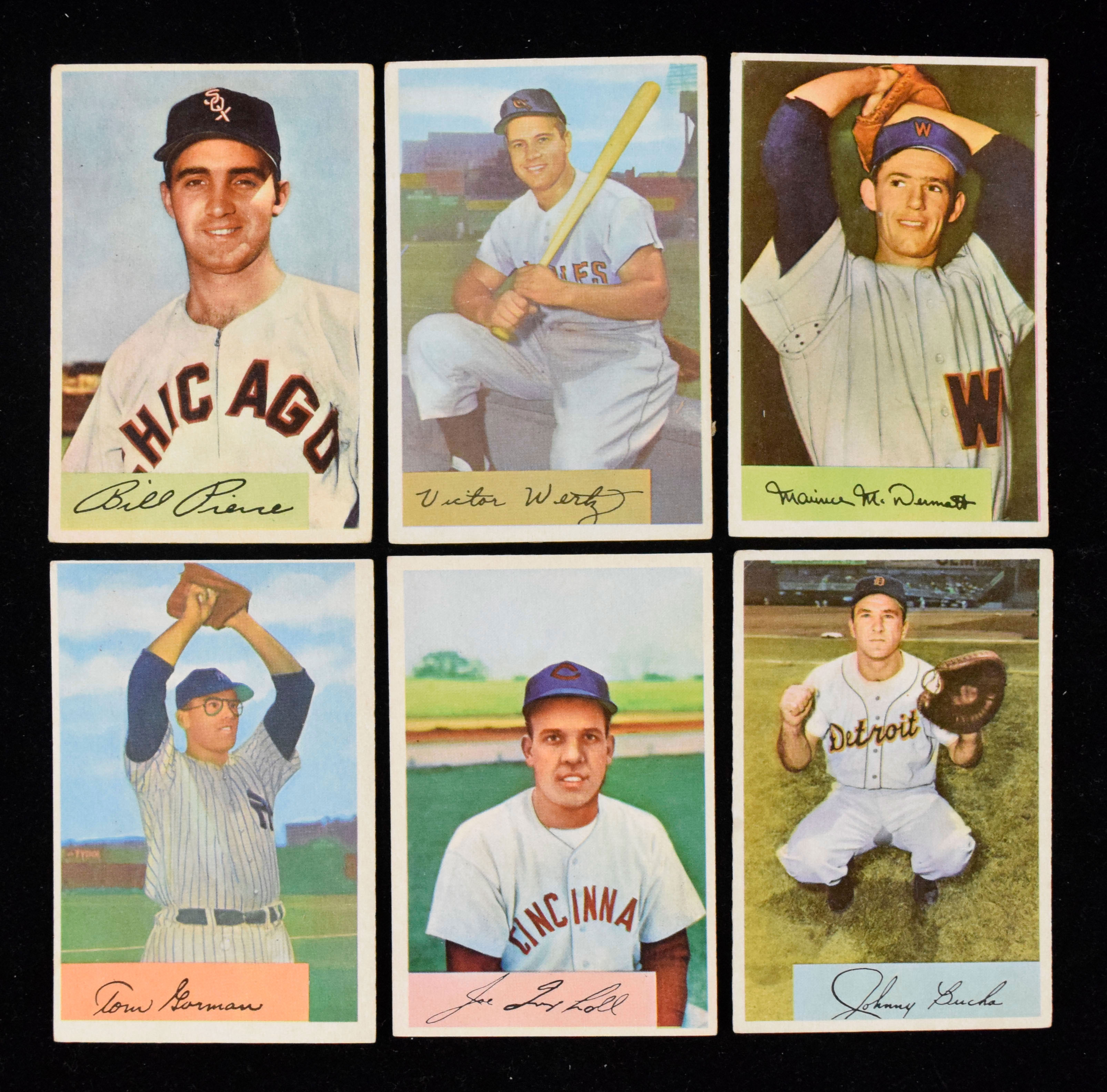 Description:"Lot of (130) 1954 Bowman cards with minor stars and many duplicates (PR-EX). Nice quantity of classic 1954 Bowman cards is in numeric order with moderate to heavy duplication. Highlights include (3) #21 Vic Wertz, (4) #56 Mickey McDermott, #102 Billy Pierce and more. Most cards appear VG/EX. Range: PR-EX. "