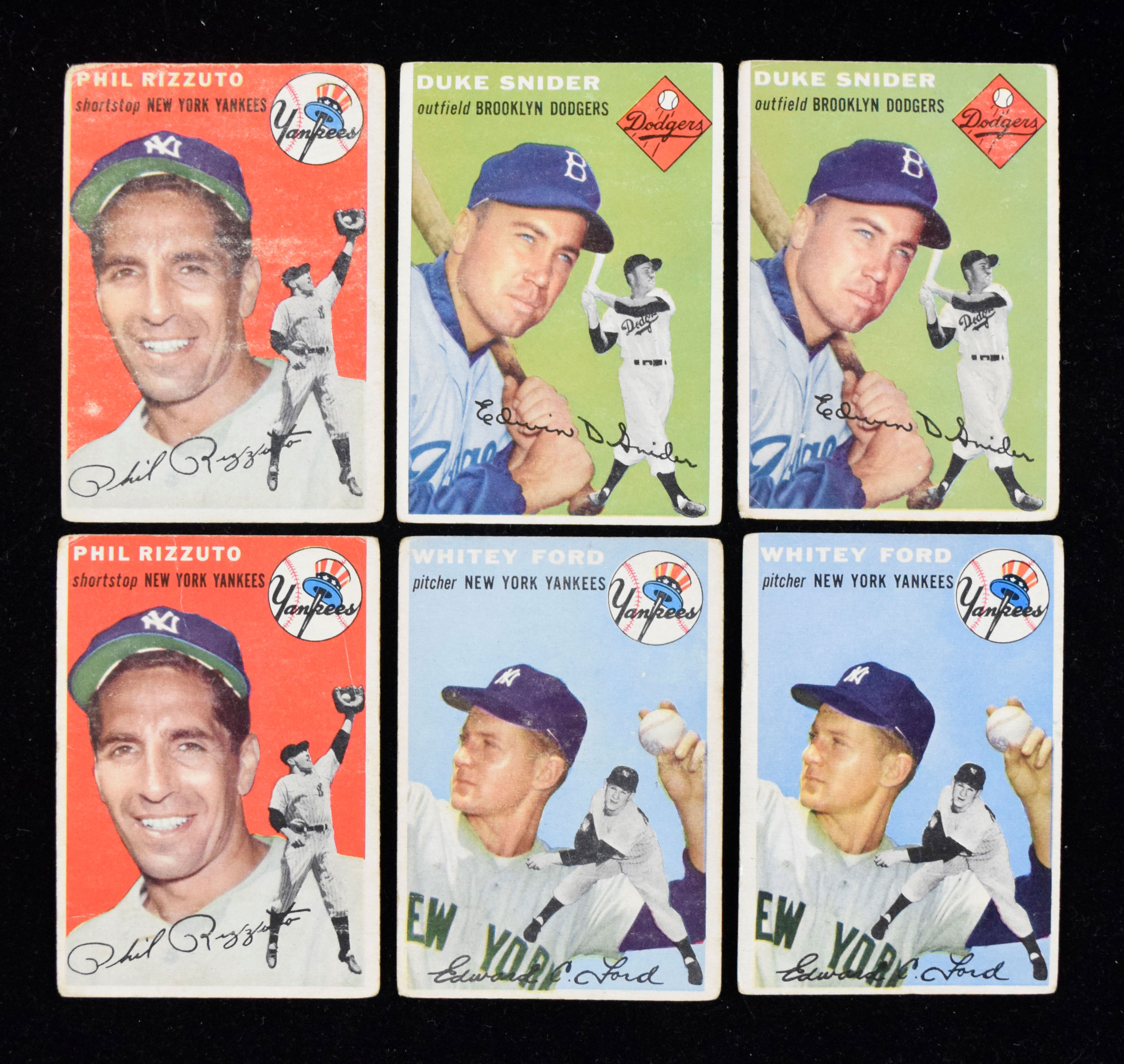 Description:"Lot of (14) 1954 Topps stars and HOFers, with (2) of each player (PR-VG). Lot includes (2) #7 Ted Kluszewski, (2) #17 Phil Rizzuto, (2) #20 Warren Spahn, (2) #32 Duke Snider, (2) #35 Jim Gilliam, (2) #37 Whitey Ford and (2) #45 Richie Ashburn. High-value lot, but cards are low-grade GD. Range: PR-VG. "