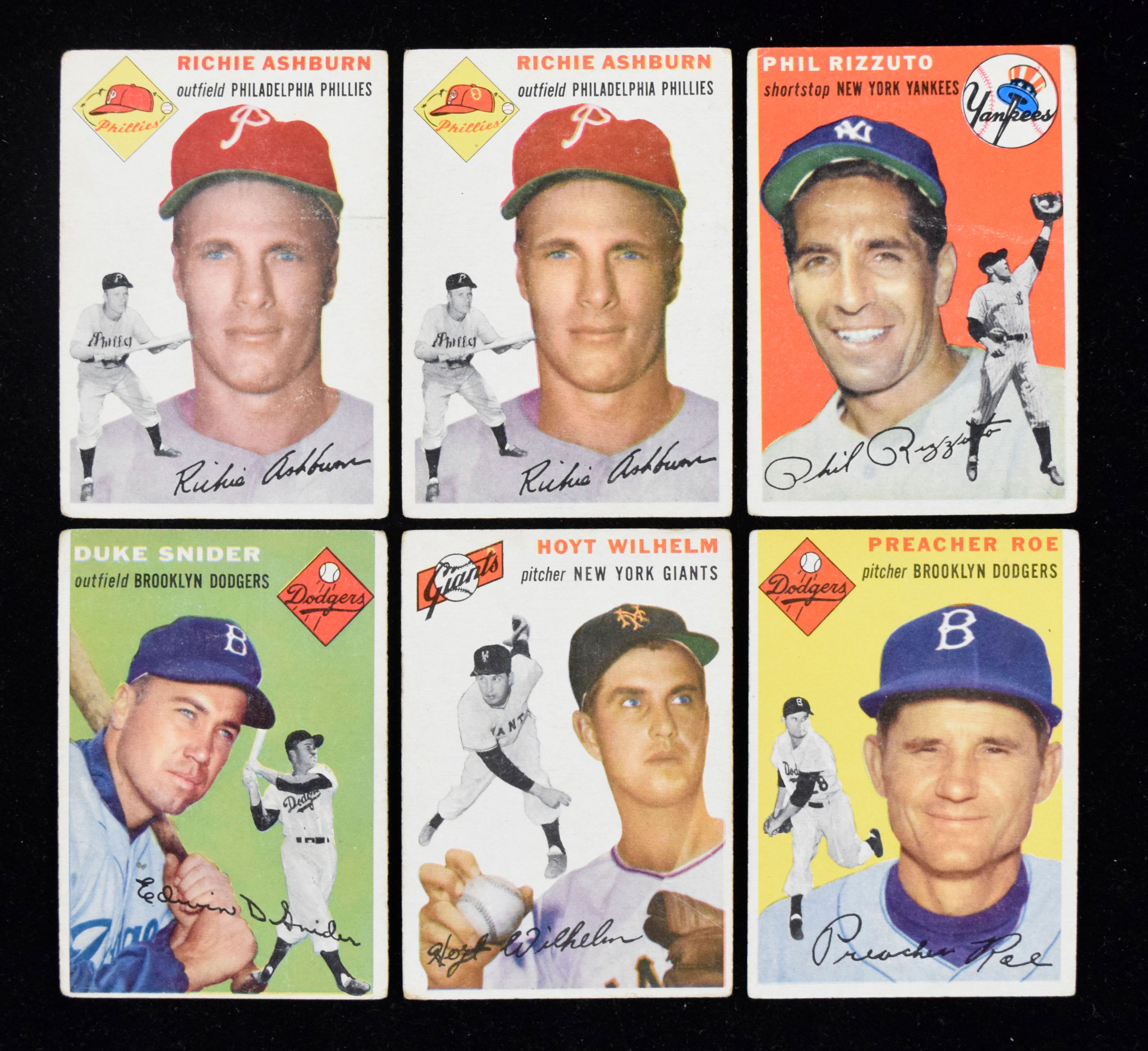 Description:"Lot of (96) 1954 Topps cards with stars and HOFers, including (3) Richie Ashburn (PR-VG/EX). Nice quantity of classic 1954 Topps cards is in numeric order with moderate to heavy duplication. Highlights include (3) #5 Ed Lopat, #7 Ted Kluszewski, (5) #14 Preacher Roe, #17 Phil Rizzuto, #20 Warren Spahn, (5) #23 Luke Easter, #32 Duke Snider, #35 Hoyt Wilhelm, (3) # 45 Richie Ashburn and more. Most cards appear GD-VG, including a few with writing. Range: PR-VG/EX. "