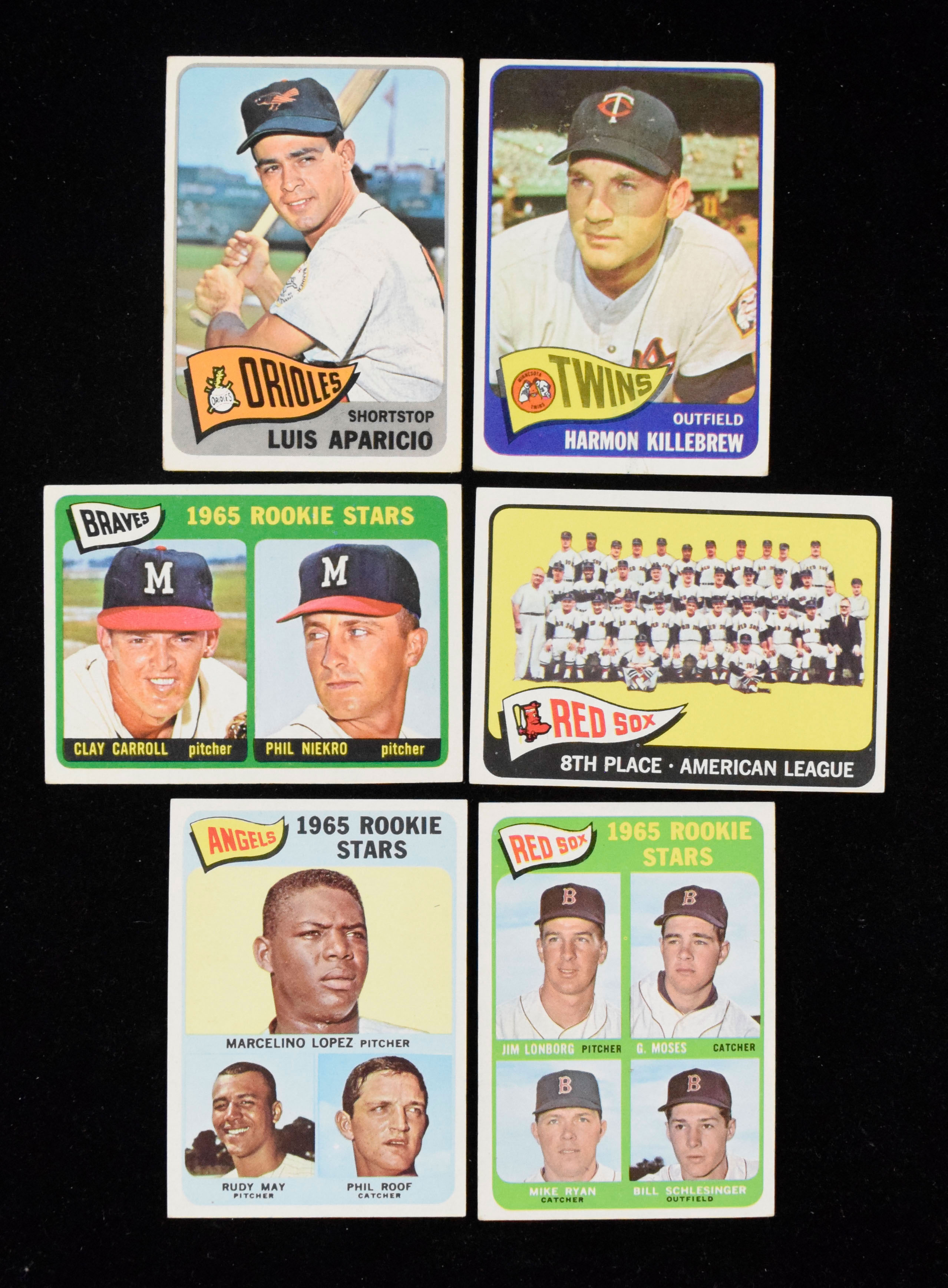 Description:"Lot of (300+) 1965 Topps cards with minor stars and (150+) high numbers (PR-EX/MT). Nice quantity of classic 1965s, among the most popular of Topps' vintage issues. Lot includes primarily commons and minor stars, with a few stars sprinkled around, such as #400 Harmon Killebrew, #410 Luis Aparicio, #461 Phil Niekro and #573 Jim Lonborg RC. Lot also includes (150+) high numbers, including SPs, from the final series (#s 371-598). There is light duplication, and most cards appear VG/EX. Range: PR-EX/MT. "
