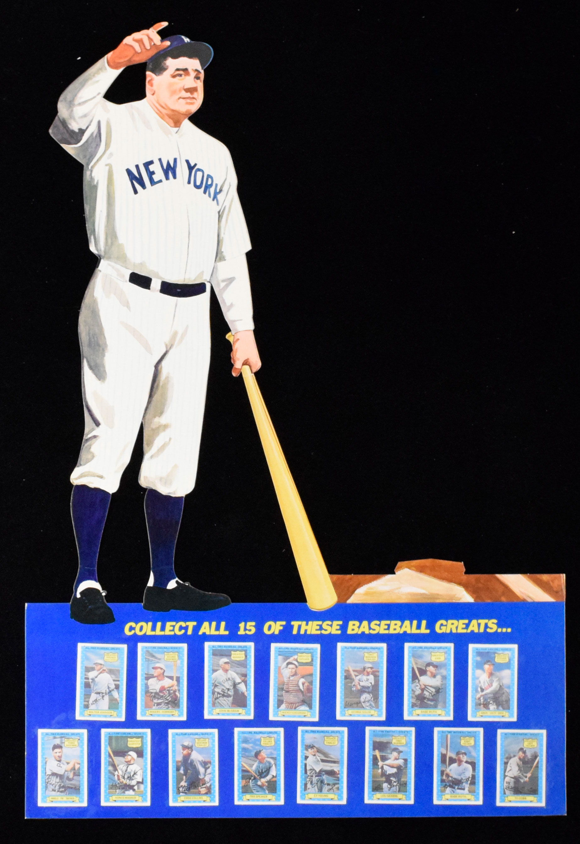 Description:Large 1972 Kellogg's All-Time Greats store advertising display with Babe Ruth (EX). Outstanding original store display piece includes 28" cardboard Babe Ruth figure attached to a 25" x 12" base with foldout stand. A complete 15-card set of 1972 Kellogg's All-Time Greats has been adhered to the base, with several of the cards exhibiting varying degrees of cracking. Backing pole stand is not included. Piece has a few minor bends, creases and dings but remains in outstanding display condition: EX.