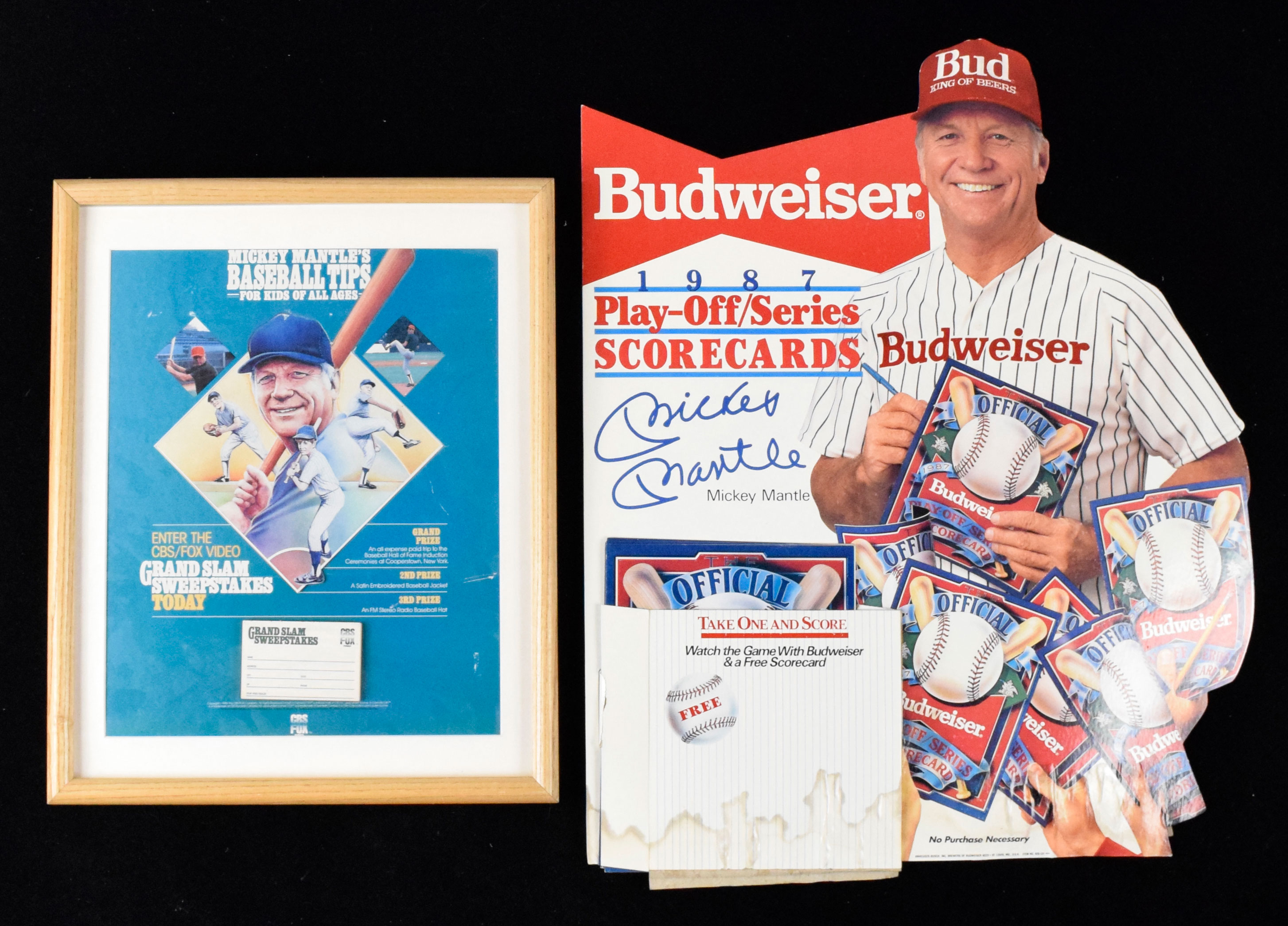 Description:Lot of (2) 1986-1987 Mickey Mantle advertising display pieces (PR-EX). Lot includes a CBS/Fox Video Grand Slam Sweepstakes display (framed to 17"x21") with original sweepstakes coupons as part of a promotion for the 1986 "Mickey Mantle's Baseball Tips for Kids of All Ages" video. The piece, framed to 17"x21," exhibits a few minor scratches on the front and appears EX, but complete condition is unknown due to framing. Also included is a 1987 Budweiser Mickey Mantle Playoff/Series Scorecard display with 4 intact scorecards in the pocket. Piece, measuring 29"x24," includes foldout stand on the back. The piece is intact but has suffered water damage that affects roughly its bottom third as well as the foldout stand on the back. There is also a small spot of writing on the stand: PR.
