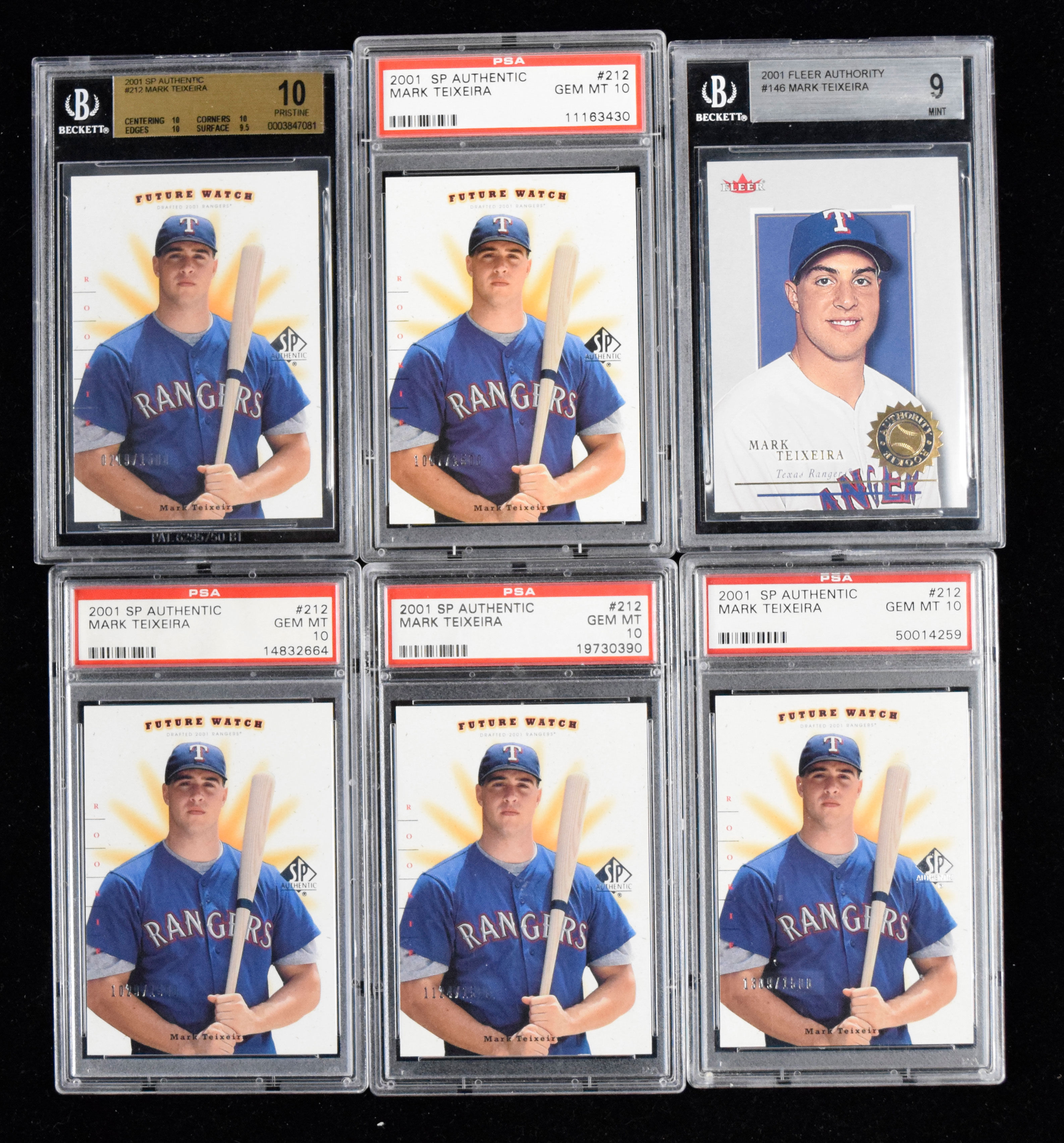 Description:Lot of (6) graded Mark Teixeira serial numbered rookie cards (all 9s and 10s). Includes 2001 Fleer Authority #146 Teixeira rookie #ed 731/2001 (Beckett 9 MT), and (5) 2001 SP Authentic #212 Teixiera rookies #ed out of 1500 (Beckett 10 PRISTINE and four PSA 10 GEM MINT).