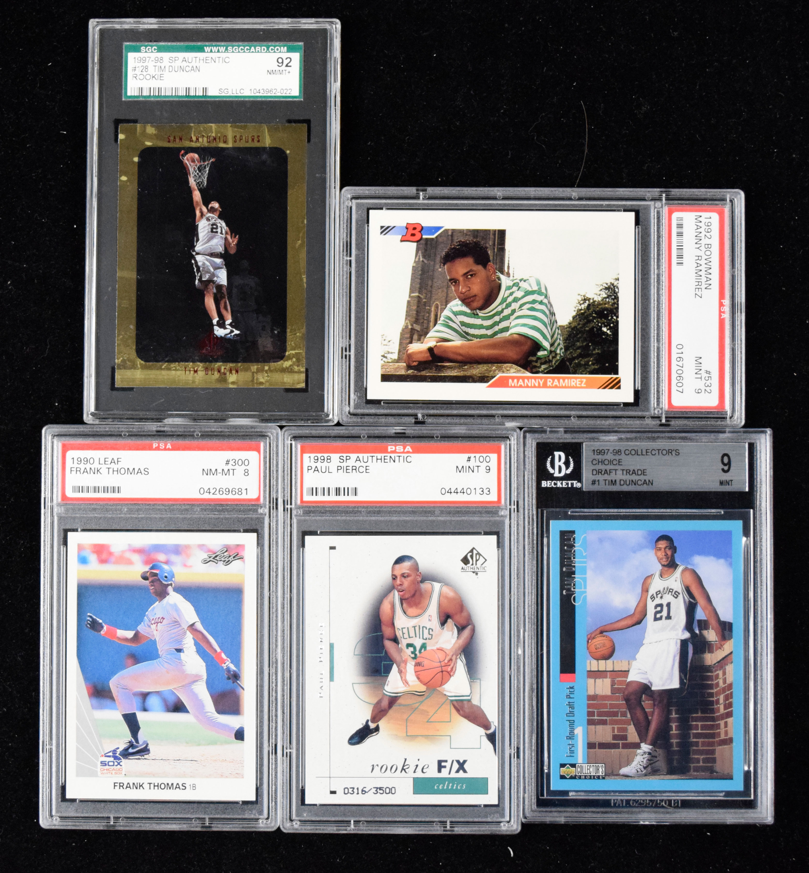 Frank Thomas, Manny Ramirez, Paul Pierce, (2) Tim Duncan graded rookie cards (NM/MT-MT). Includes 1990 Leaf #300 Thomas (PSA 8 NM/MT), 1992 Bowman #532 Ramirez (PSA 9 MT), 1997-98 SP Authentic #128 Duncan (SGC 92 NM/MT+), 1997-98 Upper Deck Collector's Choice "Draft Redemption" #1 Duncan (Beckett 9 MT), and 1998-98 SP Authentic #100 Pierce #ed 316/3500 (PSA 9 MT).