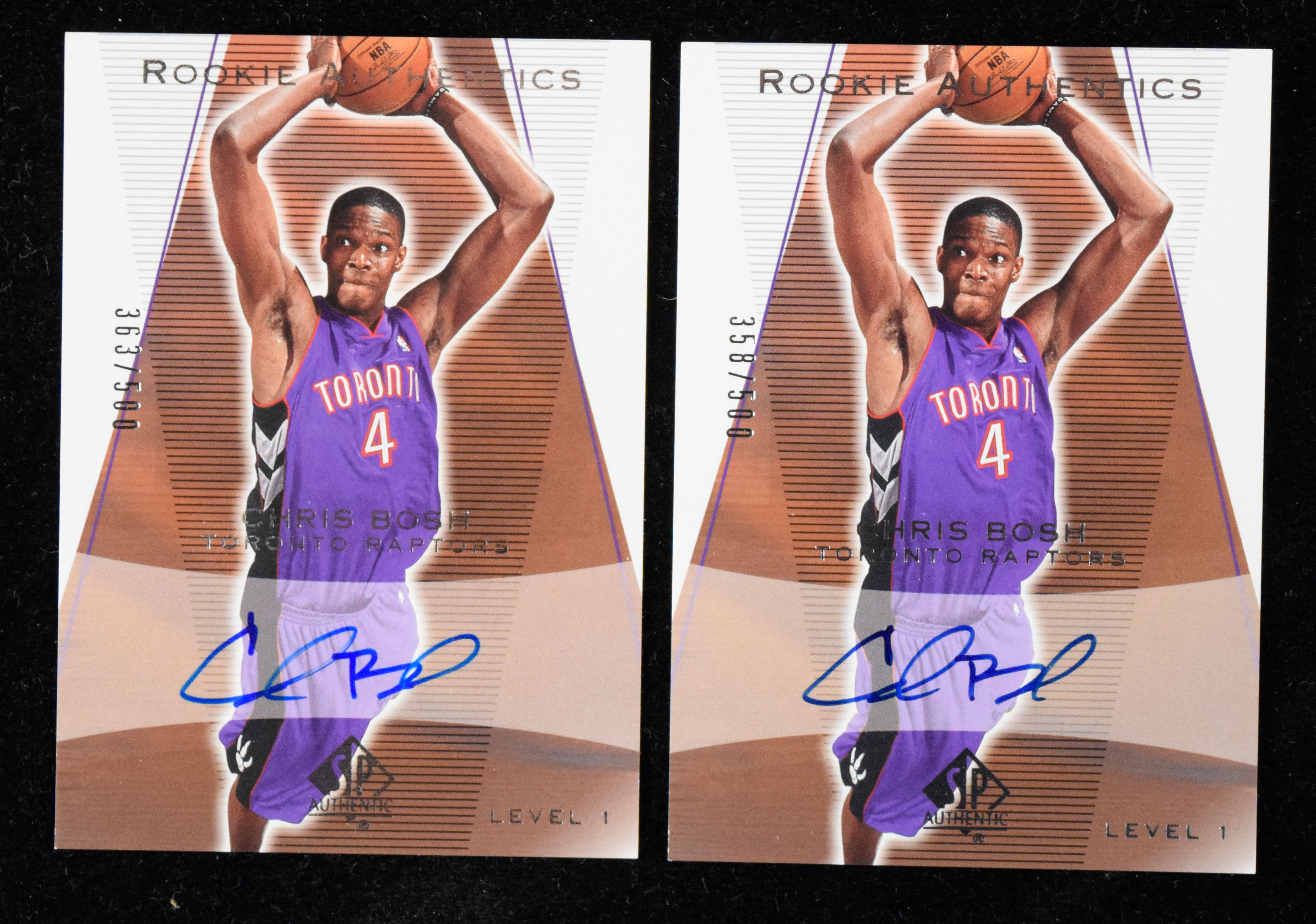 Description:Lot of (2) Chris Bosh signed 2003-04 SP Authentic serial #ed rookie cards (NM-NM/MT). Includes (2) 2003-04 SP Authentic #151 both signed by Bosh in blue fine tip marker. Signatures rate 9 to 10 out of 10. The cards are #ed 358/500 and 363/500: NM-NM/MT