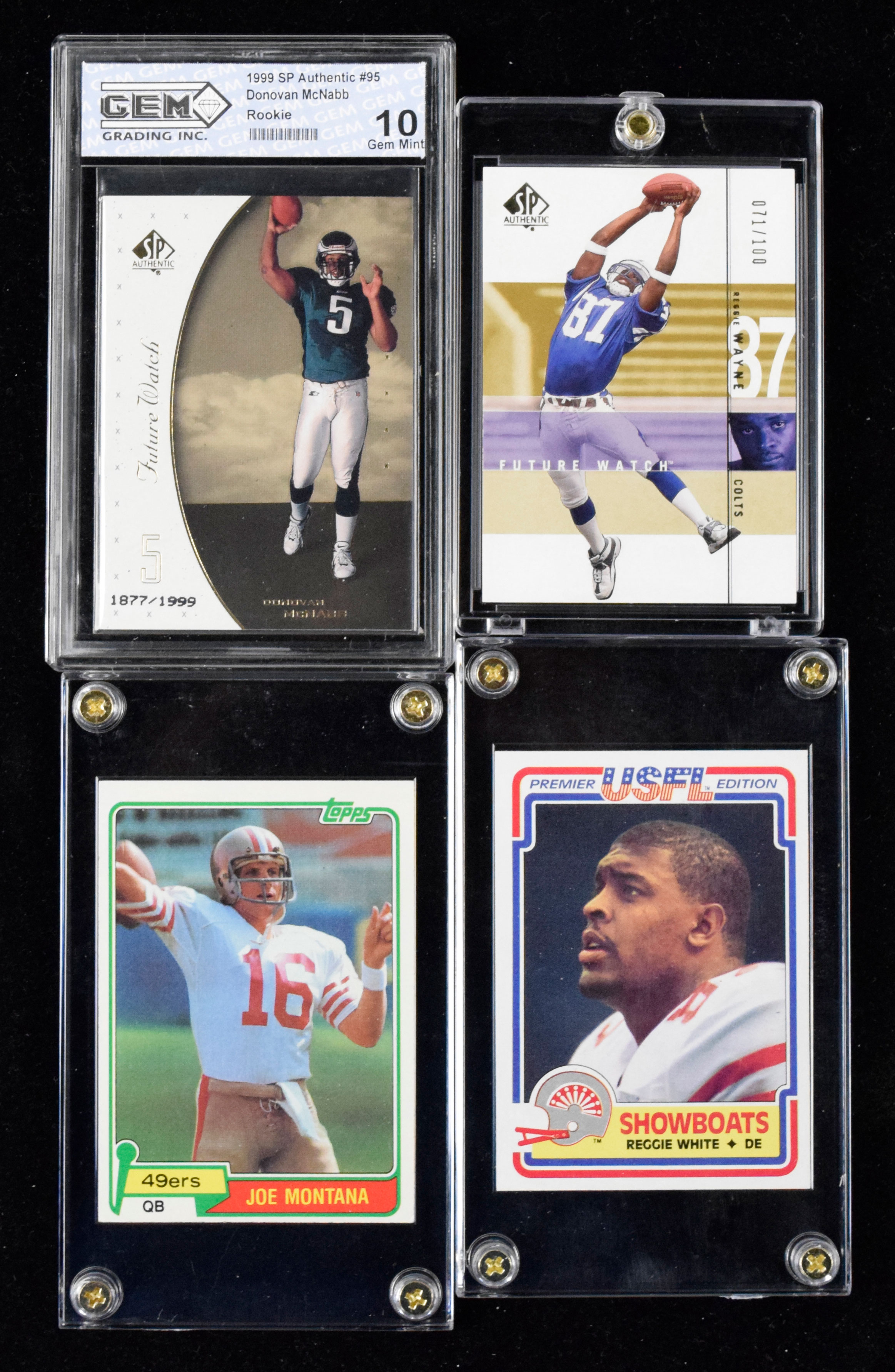 Reggie White, Joe Montana, Donovan McNabb, Reggie Wayne rookie cards (EX oc - MT). Includes 1981 Topps #216 Montana (EX oc), 1984 Topps USFL #58 White (NM), 1999 SP Authentic #95 McNabb #ed 1877/1999 (NM/MT-MT), and 2001 SP Authentic "Future Watch Gold" #105 Wayne #ed 71/100 (NM/MT).