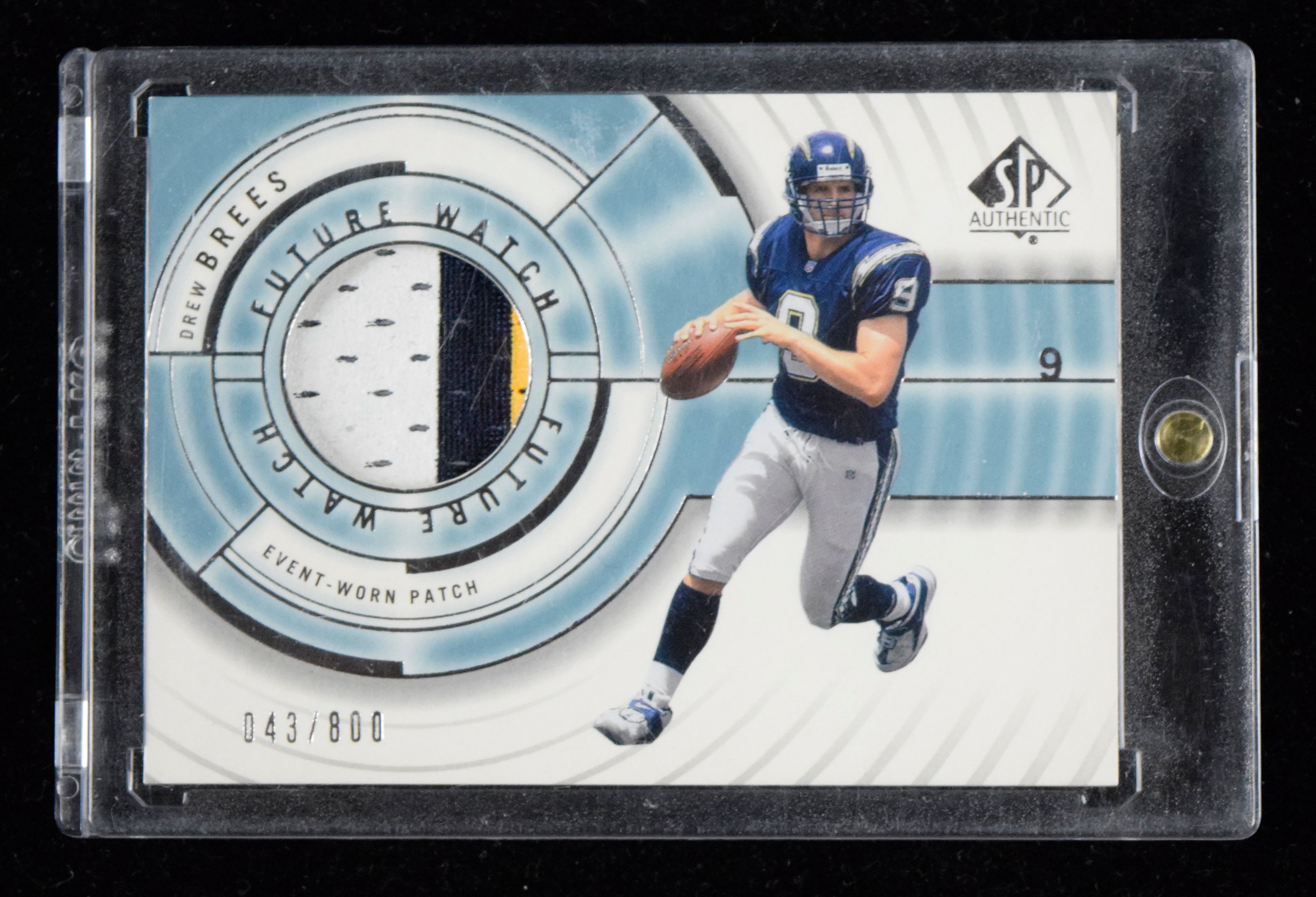 2001 SP Authentic #101 Drew Brees rookie patch card numbered 43/800 (NM/MT).