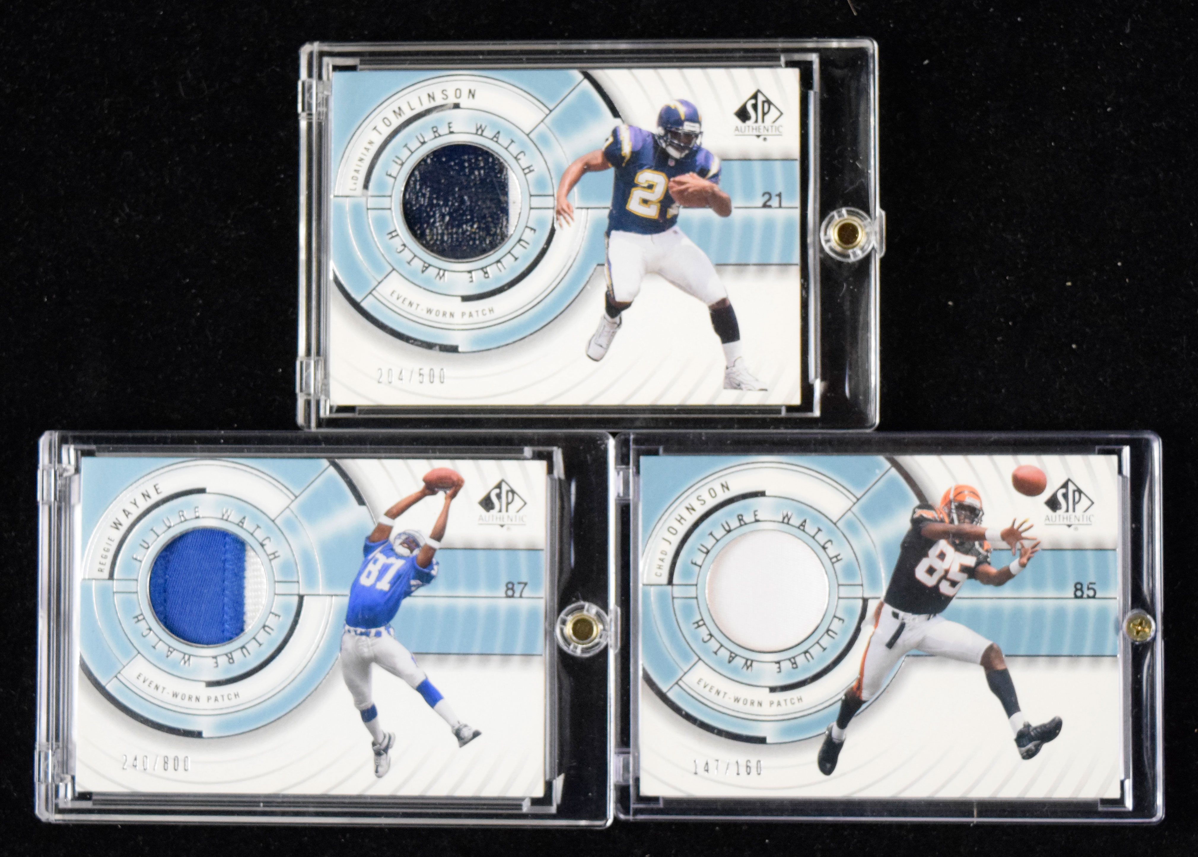 Description:LaDainian Tomlinson, Reggie Wayne, and Chad Johnson serial #ed 2001 SP Authentic rookie patch cards (NM-NM/MT). Includes #s 104 Chad Johnson (#ed 147/160), 105 Reggie Wayne (#ed 240/800), and 120 LaDainian Tomlinson (#ed 204/500): NM-NM/MT