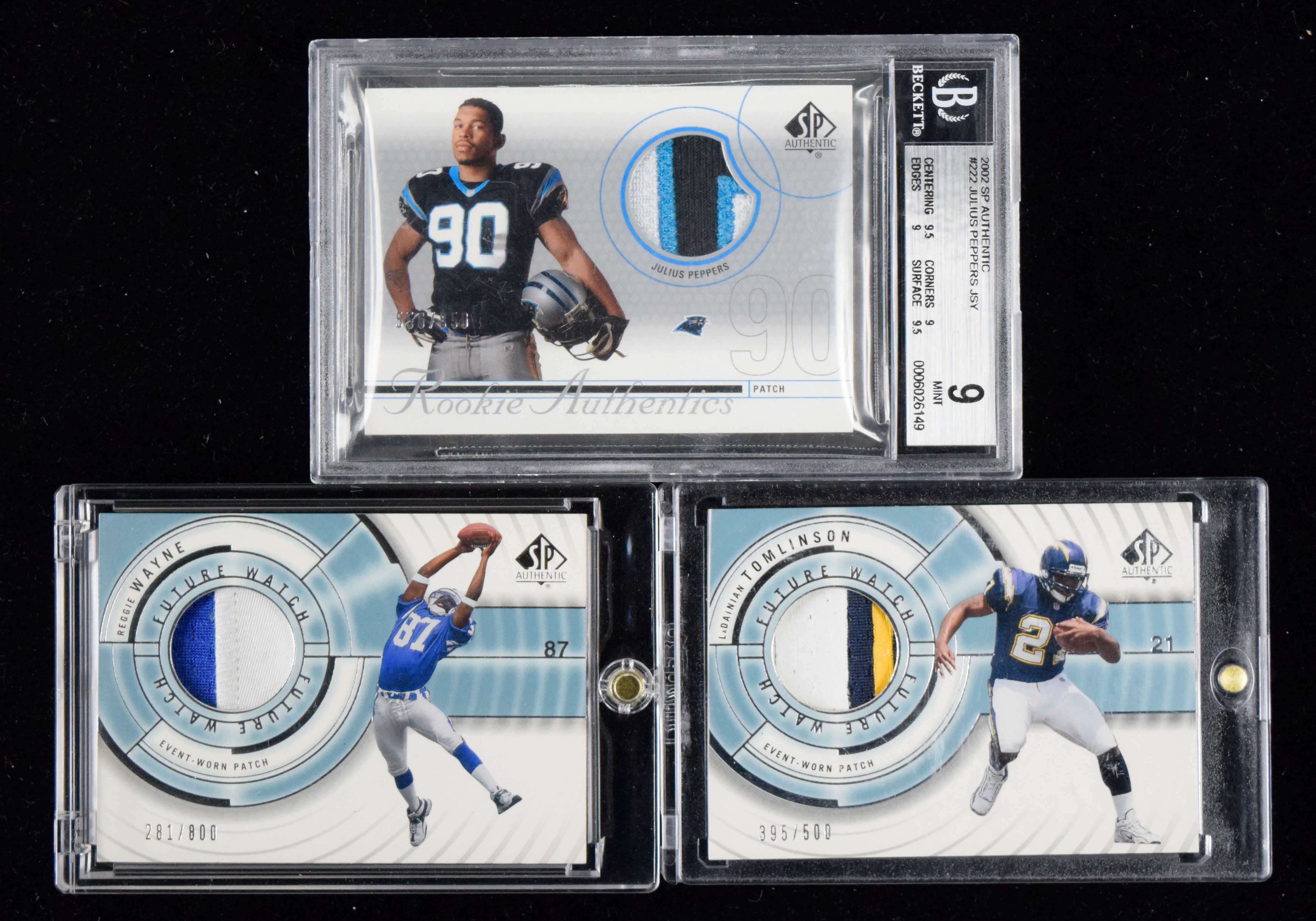 LaDainian Tomlinson, Reggie Wayne, and Julius Peppers serial numbered rookie patch cards (NM-MT). Includes 2001 SP Authentic #s 105 Wayne numbered 281/800, and 120 Tomlinson numbered 395/500, and 2002 SP Authentic #222 Peppers numbered 556/850 (Beckett 9 MT).