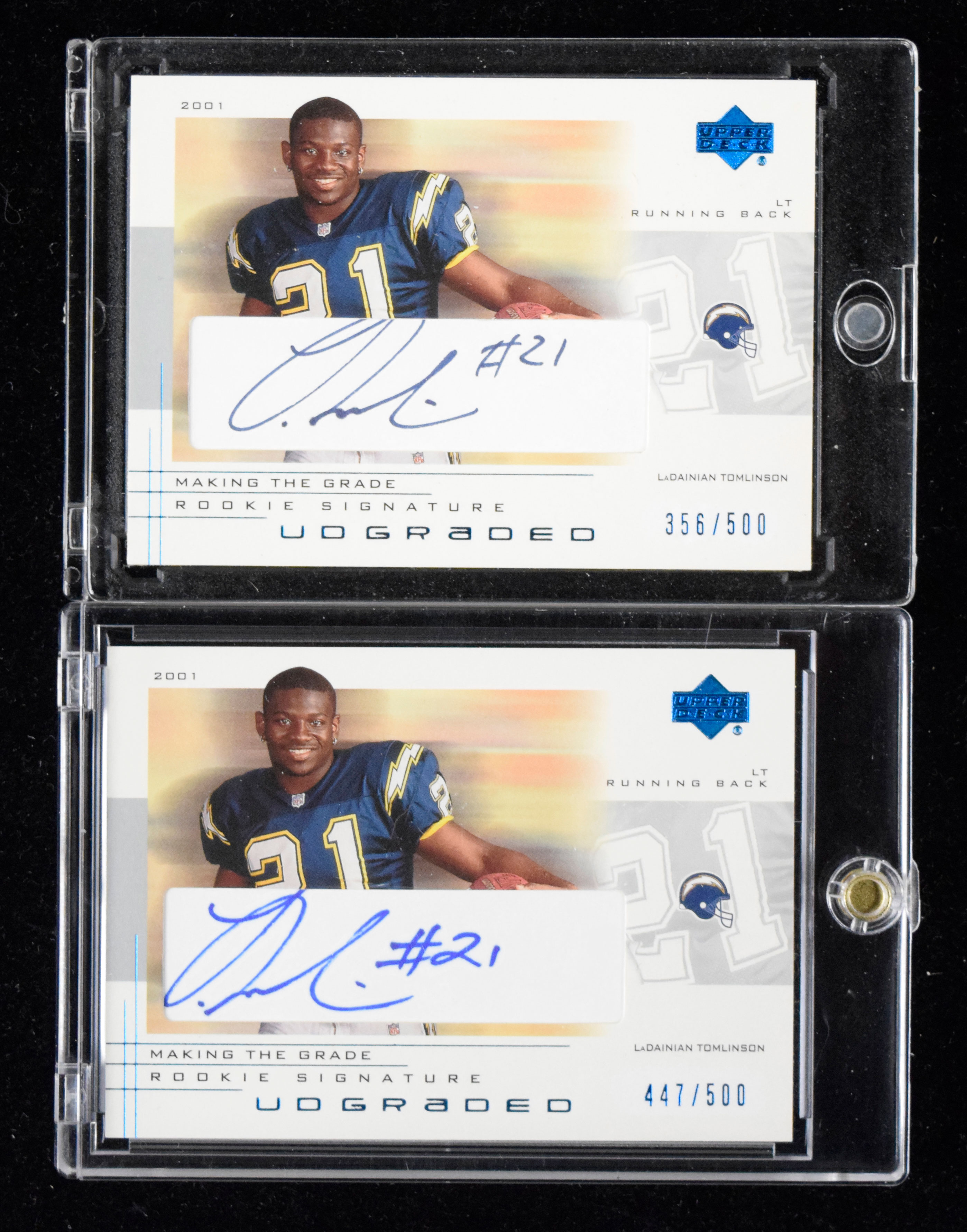 Description:Lot of (2) LaDainian Tomlinson signed 2001 Upper Deck Graded serial #ed rookie insert cards (NM-NM/MT). Includes (2) 2001 Upper Deck Graded "Rookie Autographs" #53 signed by Tomlinson. Signatures rate 8/9 to 9 out of 10. The cards are #ed 356/500 and 447/500: NM-NM/MT